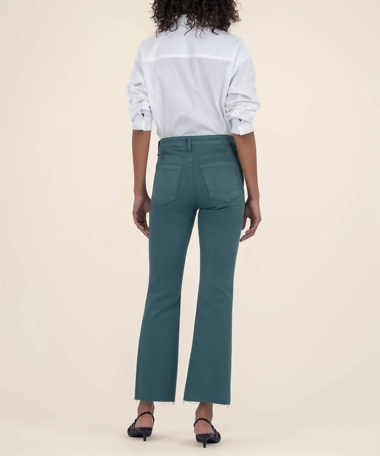Elevate your denim collection with the Kelsey High Rise Gab Ab Jeans by KUT FROM THE KLOTH in striking teal. These jeans feature a high-rise design and a classic fit that flares at the ankle with an inseam of 27.75 inches, creating a trendy silhouette with a 10.25-inch rise and 17.75-inch leg opening. Made from 98% cotton and 2% spandex, they offer a soft, low-stretch fabric for comfort and fab ab front pockets that ensure a smooth look. Closure: Button closure. Care Instructions: Machine wash and lay flat to dry.