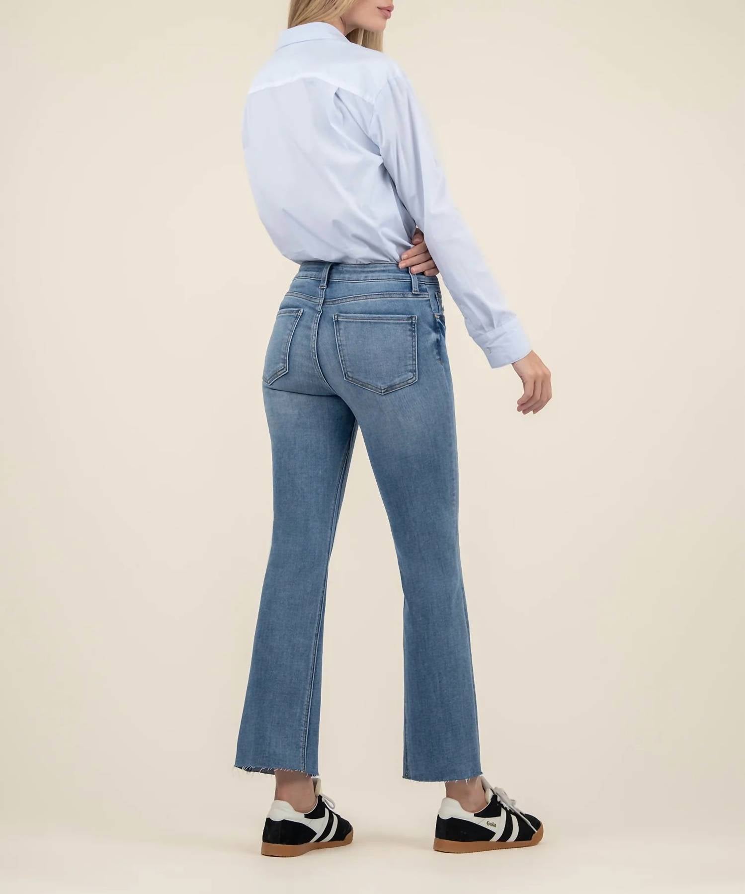 Elevate your denim collection with the Kelsey Mid Rise Ankle Flare Jeans by KUT FROM THE KLOTH, crafted from 94% Cotton, 5% Polyester, 1% Spandex in a chic Motivation color. These jeans feature a regular fit with a flattering mid rise and an inseam of 29 inches, complemented by a flared leg style and a leg opening of 19 inches. Featuring a practical zip closure and five-pocket design, these solid pattern jeans are perfect for a casual, concert-ready look. Care is effortless with machine wash and tumble dry instructions, making them a go-to choice for your streetwear-inspired spring wardrobe.
