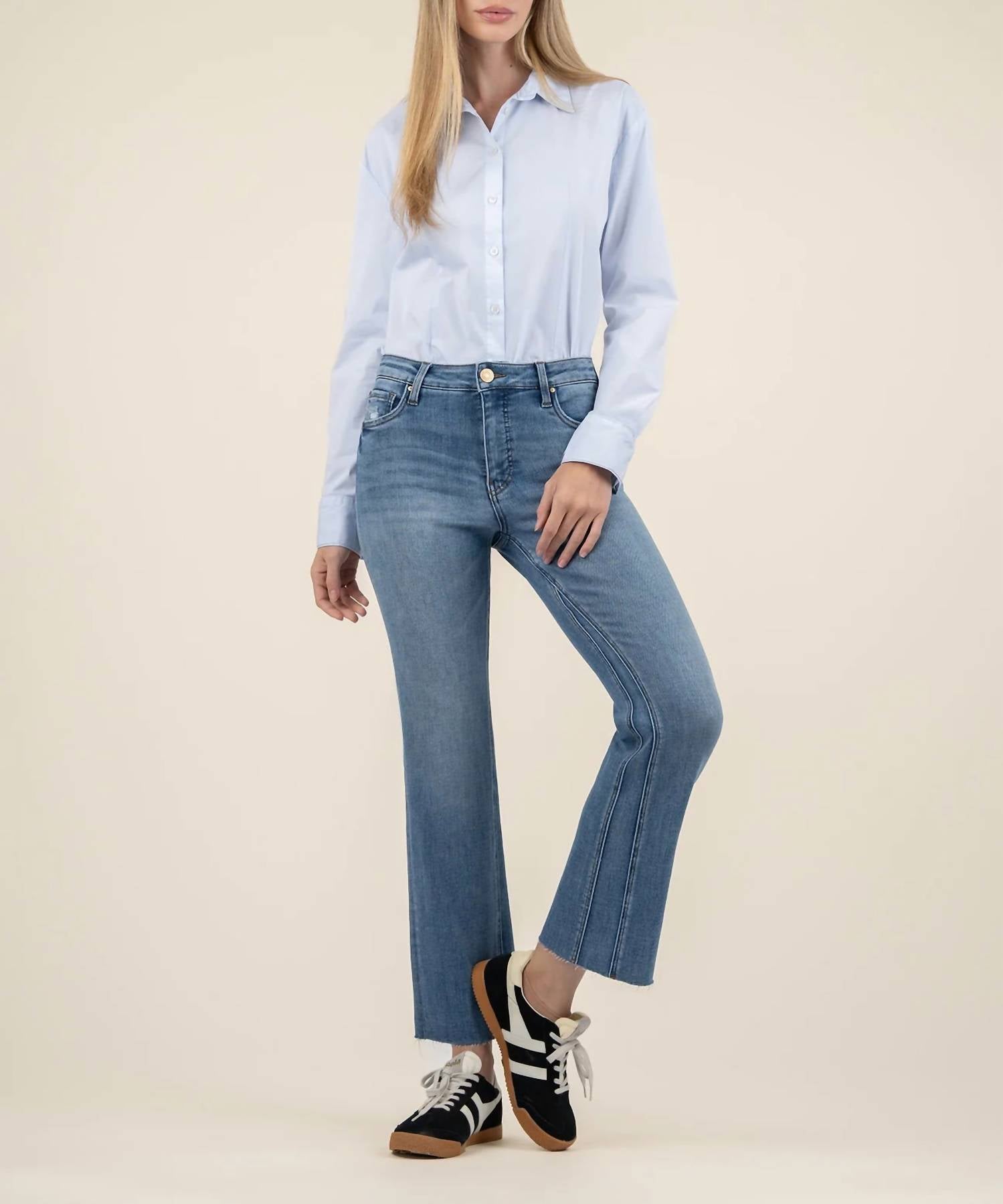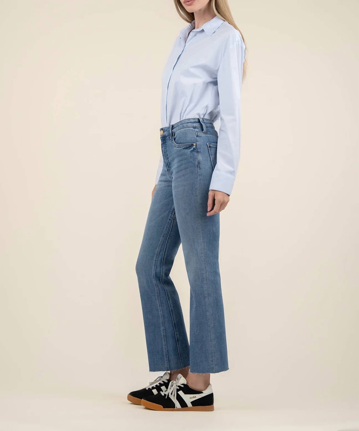 Pair these wide leg jeans with mules, slides or your favorite strappy sandals. Elevate your denim collection with the Kelsey Mid Rise Ankle Flare Jeans by KUT FROM THE KLOTH, crafted from 94% Cotton, 5% Polyester, 1% Spandex in a chic Motivation color. These jeans feature a regular fit with a flattering mid rise and an inseam of 29 inches, complemented by a flared leg style and a leg opening of 19 inches. Featuring a practical zip closure and five-pocket design, these solid pattern jeans are perfect for a casual, concert-ready look. Care is effortless with machine wash and tumble dry instructions, making them a go-to choice for your streetwear-inspired spring wardrobe.