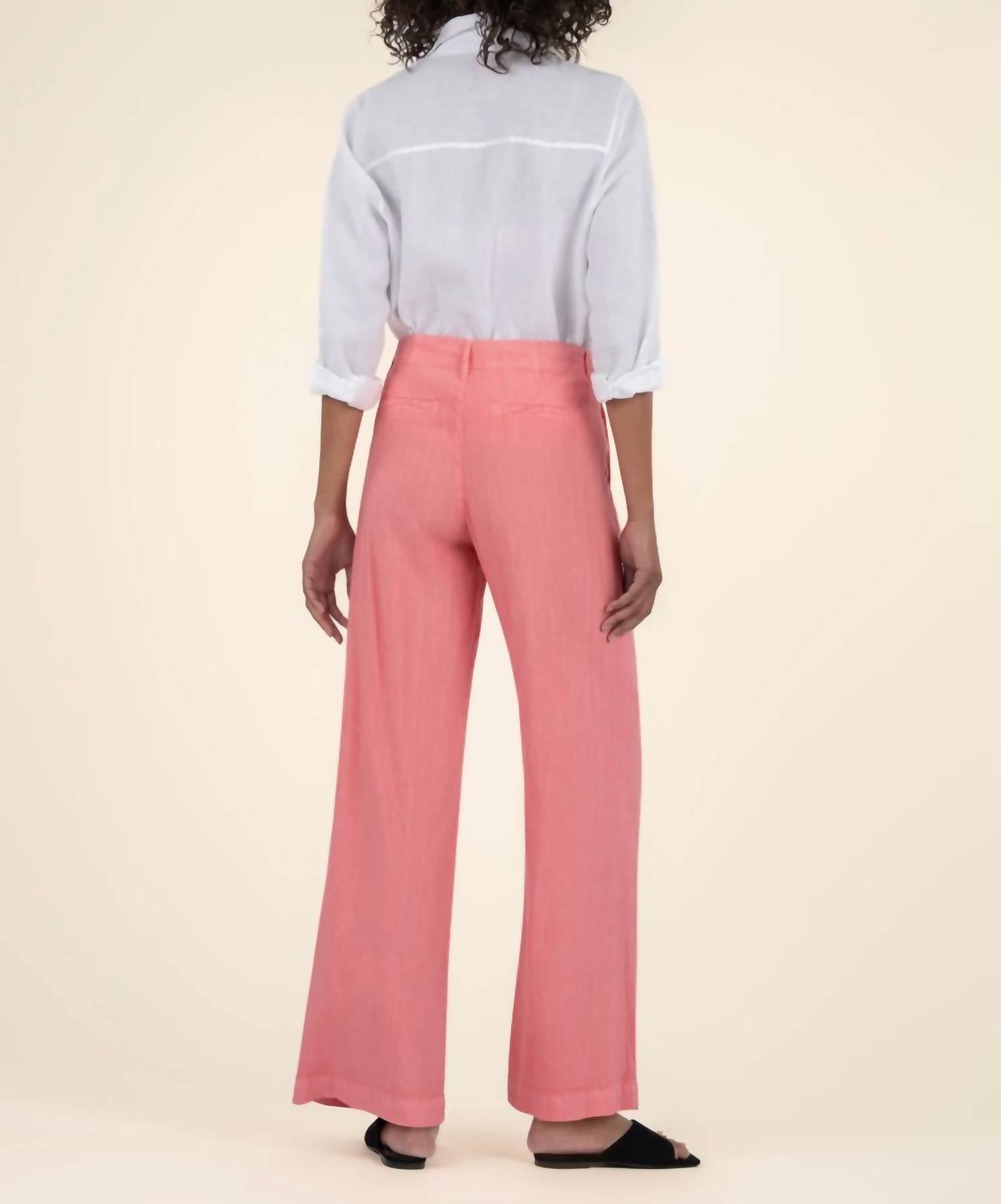 Step into style with the Meg Linen Wide Leg Pants by KUT FROM THE KLOTH, a perfect summer wardrobe addition in a refreshing salmon hue. With a high-rise waist and relaxed fit, these pants boast a wide-leg style and inseam of 30", complete with a leg opening of 23" and rise of 10.75". Composition: 50% Linen, 48% Rayon, 2% Spandex. Closure: Button closure. Care: Hand wash, lay flat to dry.