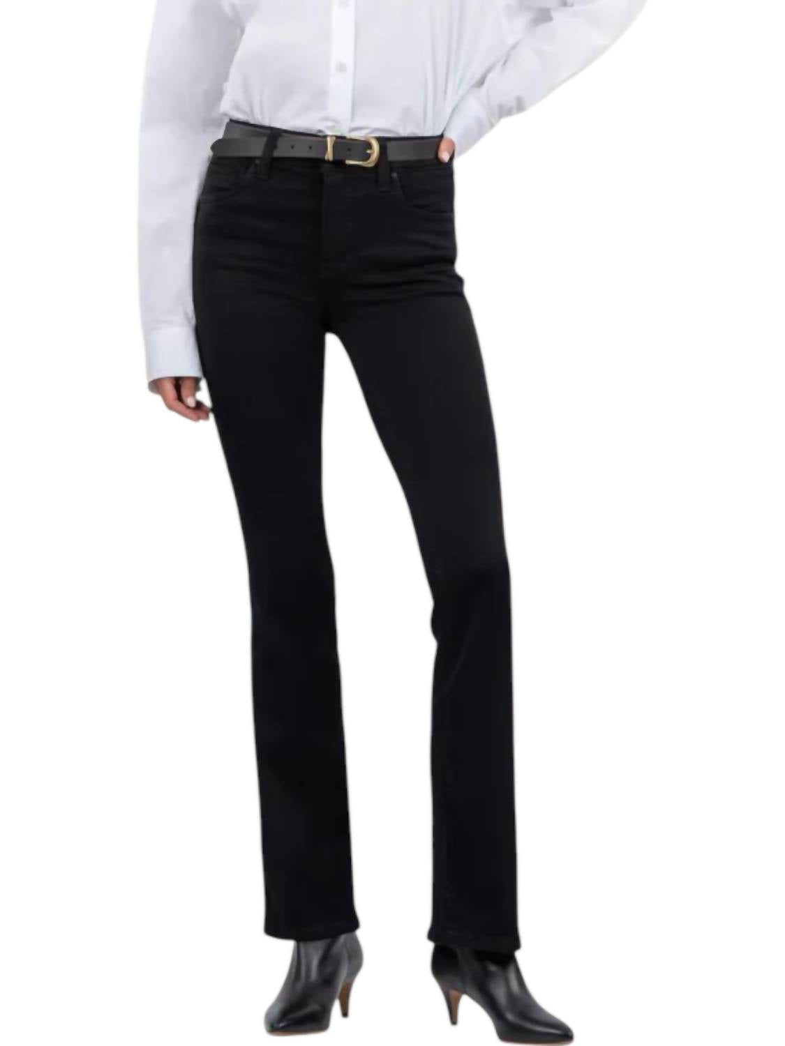 If you're looking for boot-cut, this is the jean for you. Sleek black essential that elongates your legs with its flattering silhouette. Crafted from 43% Rayon, 30% Cotton, 25% Polyester, and 2% Spandex. Feature a high rise of 10.25 inches and an inseam of 33 inches. Button closure. Machine wash cold inside out to retain color, and tumble dry low.