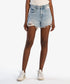 Elevate your casual summer style with the Women's Jane High Rise Long Short With Raw Hem by KUT FROM THE KLOTH. These jean shorts feature a high-rise design with frayed hems and a stylish cutout pocket detail, while the composition is made of 99% Cotton and 1% Spandex, allowing for a comfortable fit. The shorts have a button closure and boast an inseam of 4.5 inches, a leg opening of 25 inches, and a rise of 10.5 inches. For care, machine wash cold inside out and tumble dry low, or lay flat to dry for longevity, and warm iron if needed.