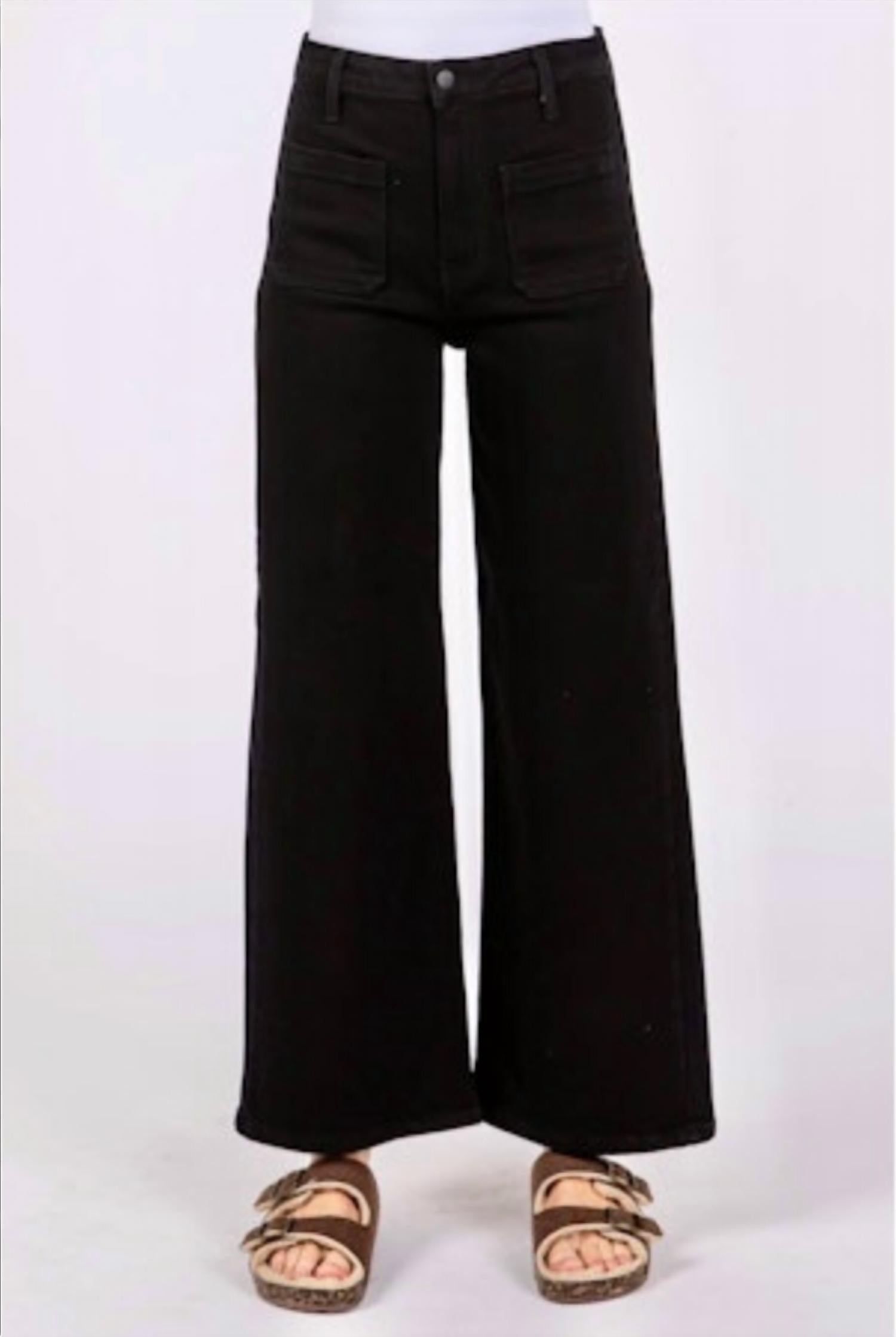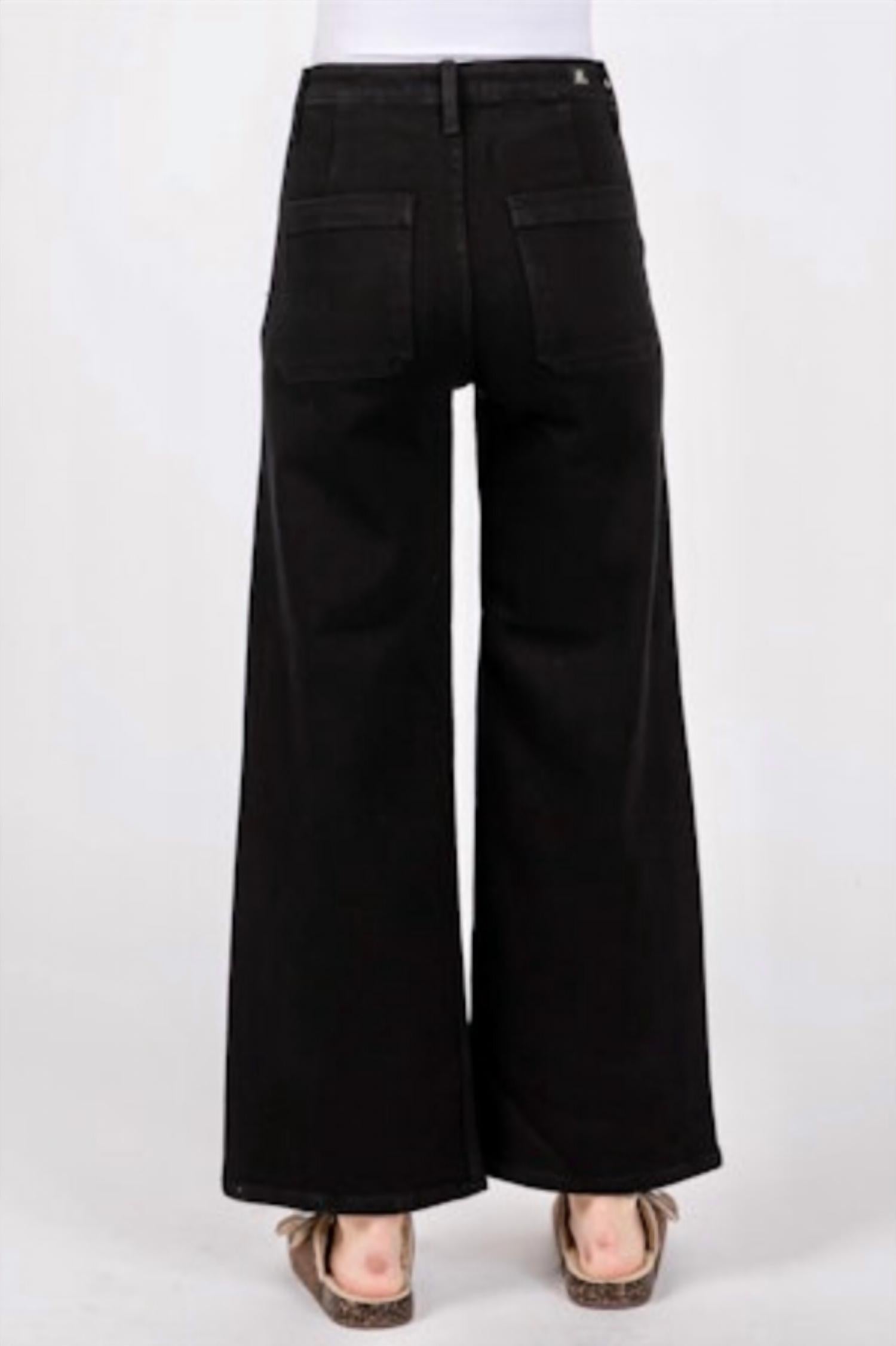 Just as cute as they are comfortable. Introducing the Bianca High Rise Sailor Patch Pocket Jeans by L.T.J, perfect for an effortlessly chic look. Crafted from a comfortable cotton blend with 92.6% cotton, 5.5% polyester, and 1.9% spandex, these jeans feature a flattering high rise of 12 inches and a 27-inch inseam. The design includes a zip closure and stylish wide leg opening of 22 inches in a classic black solid pattern, making them ideal for streetwear trends. Although care instructions are not specified, their durable material ensures lasting wear.