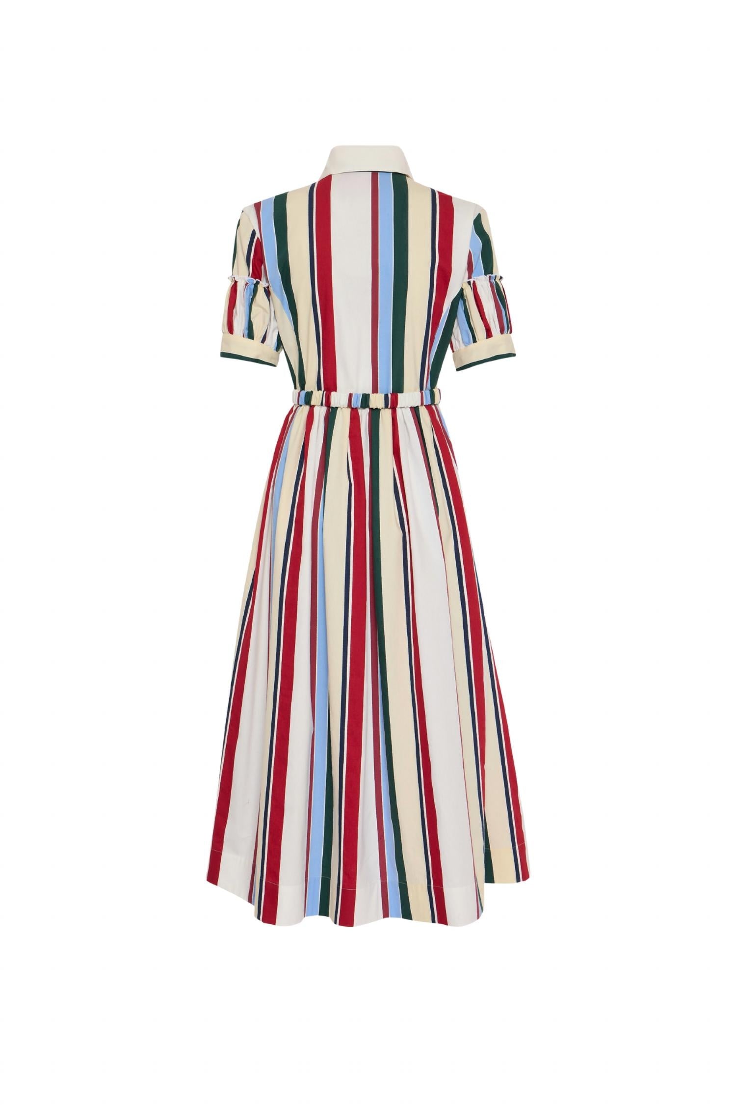 Just add slides or mules and you are good to go. Introducing the Women's Libertine Dress by La DOUBLEJ, an embodiment of sophistication with an Italian touch. This short sleeve dress, crafted from 88% cotton and 12% polyamide, boasts exquisite striped jacquard fabric. Its A-line silhouette showcases a cinched waist and full circle skirt, accentuated by scarab symbol buttons for a unique flair. Made for vacation style, this piece closes with buttons and is 100% made in Italy, ensuring that you're ready for any summer outing with elegance and ease.