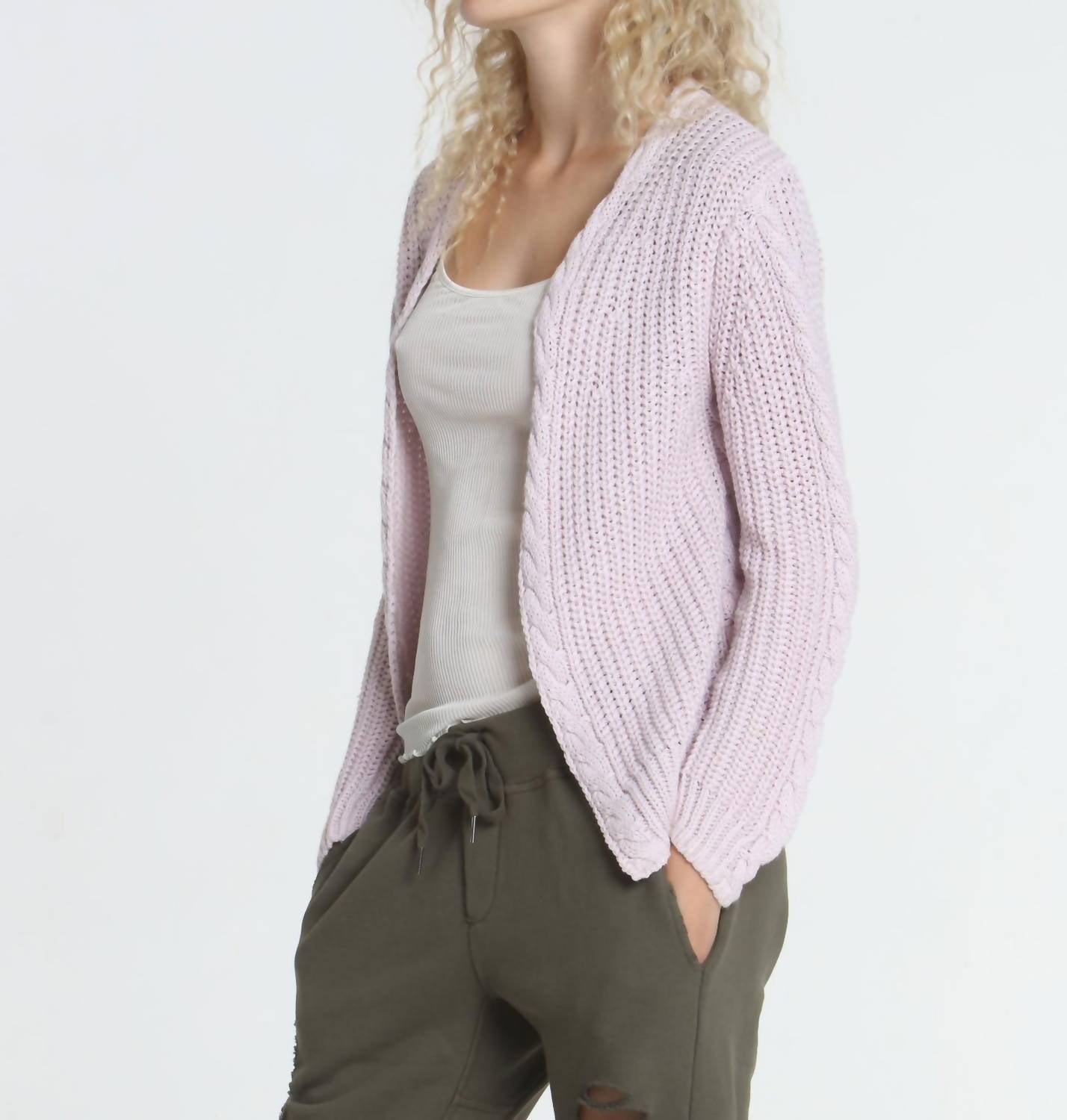 This cardigan will be a sweater-rotation favorite.Open front cardigan. Long sleeve. Rib stitch with cable. 100% Cotton. Hand wash or dry clean. Model is 5'9, wearing size small. Slim fit, cropped.