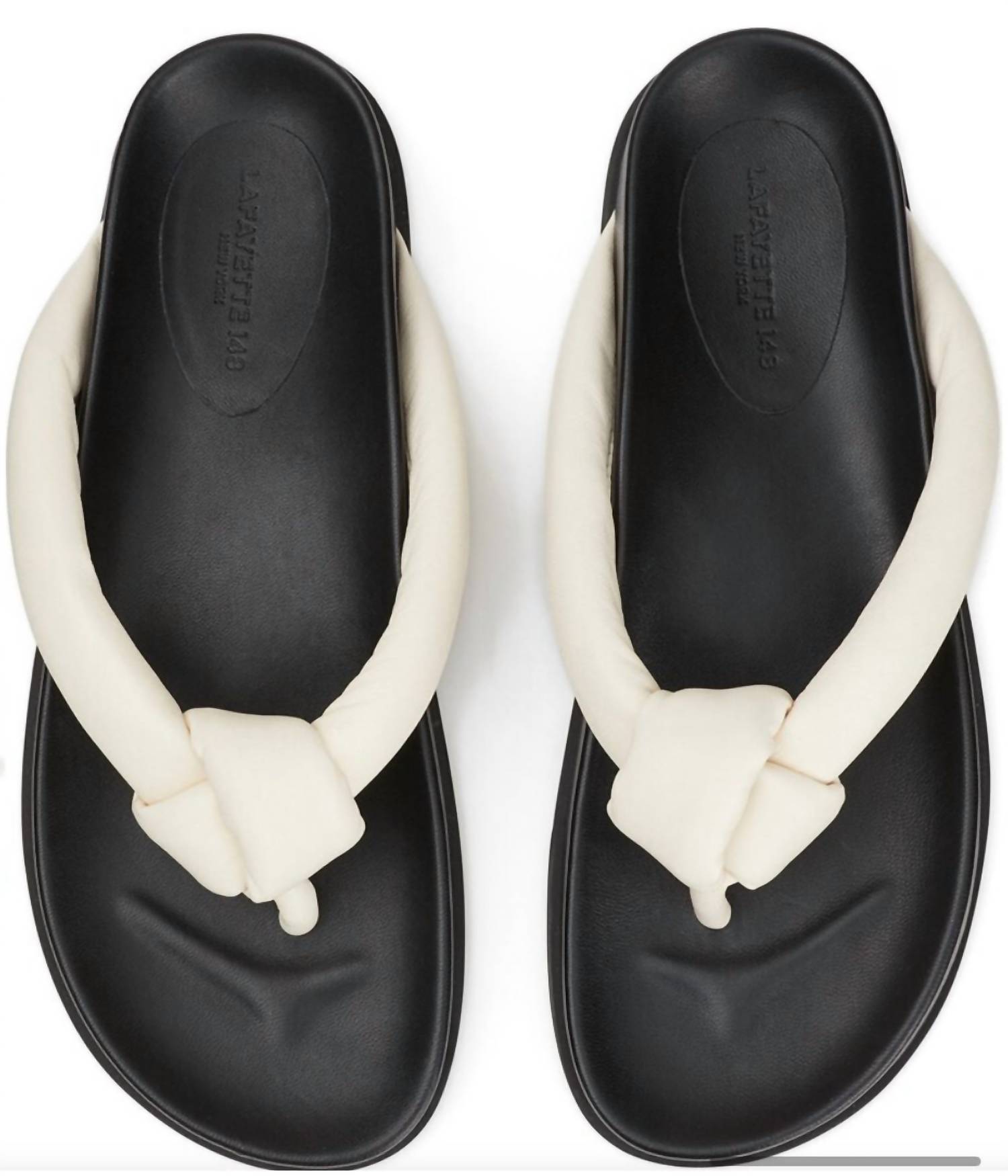 A classic loafer that is both comfortable and polished. Meet the New York Bristol Flip Flop by Lafayette 148, a chic choice for your vacation wardrobe. Crafted with a smooth leather upper and lining, these flip-flops feature a fashionable knot detail. They offer comfort with a contoured footbed and are completed with a rubber sole. Made in Spain, these minimalist, open-toe shoes are a spring essential with a flat heel design.