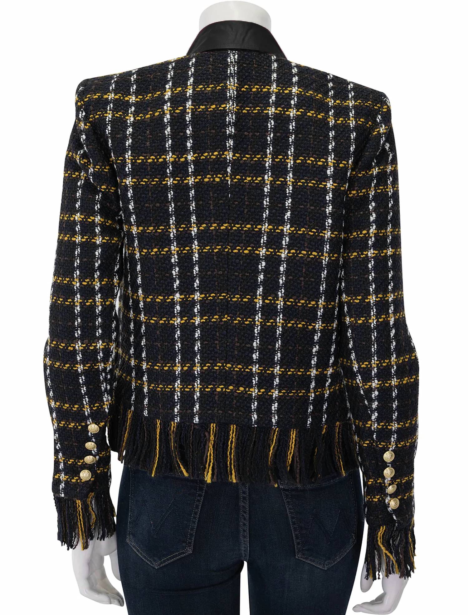 Tailored to perfection, this blazer will be your go-to jacket for years to come. Elevate your autumn wardrobe with the Belmont Fringe Jacket by L'Agence, a sophisticated blend of black, yellow, and multi plaid. Crafted from mid-weight non-stretch tweed, this piece features long sleeves with button cuffs and padded shoulders for a structured look. Composition: 100% Polyester. Gold-tone button closure at the front. Garment length measures 20.75 inches. Origin: China. Care: Dry clean only.