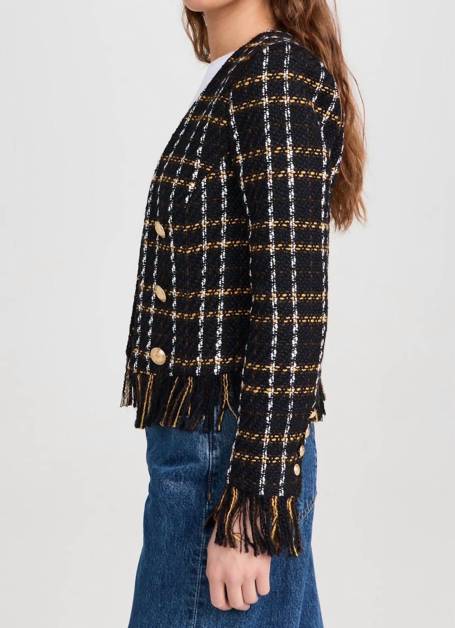Elevate your autumn wardrobe with the Belmont Fringe Jacket by L'Agence, a sophisticated blend of black, yellow, and multi plaid. Crafted from mid-weight non-stretch tweed, this piece features long sleeves with button cuffs and padded shoulders for a structured look. Composition: 100% Polyester. Gold-tone button closure at the front. Garment length measures 20.75 inches. Origin: China. Care: Dry clean only.