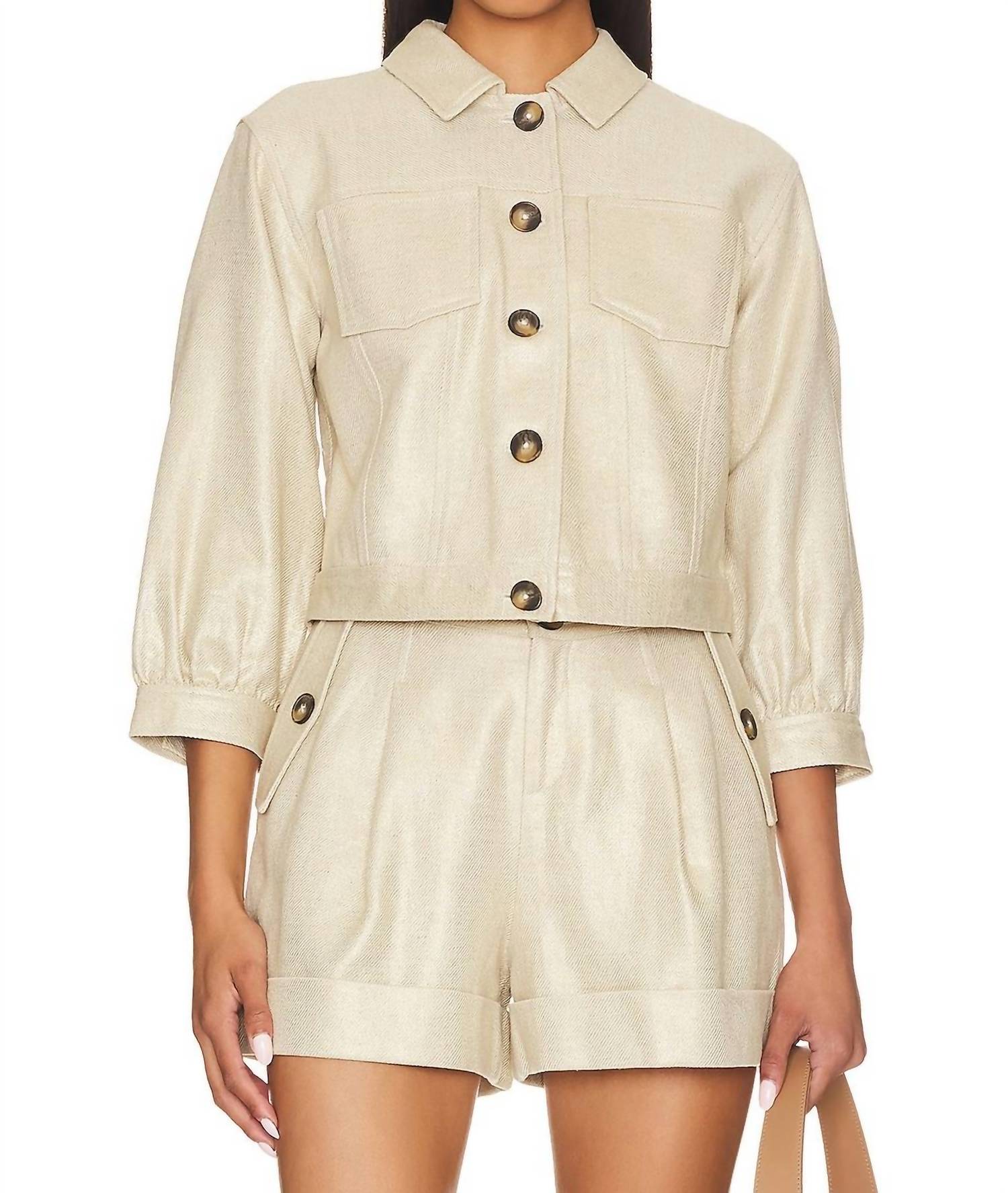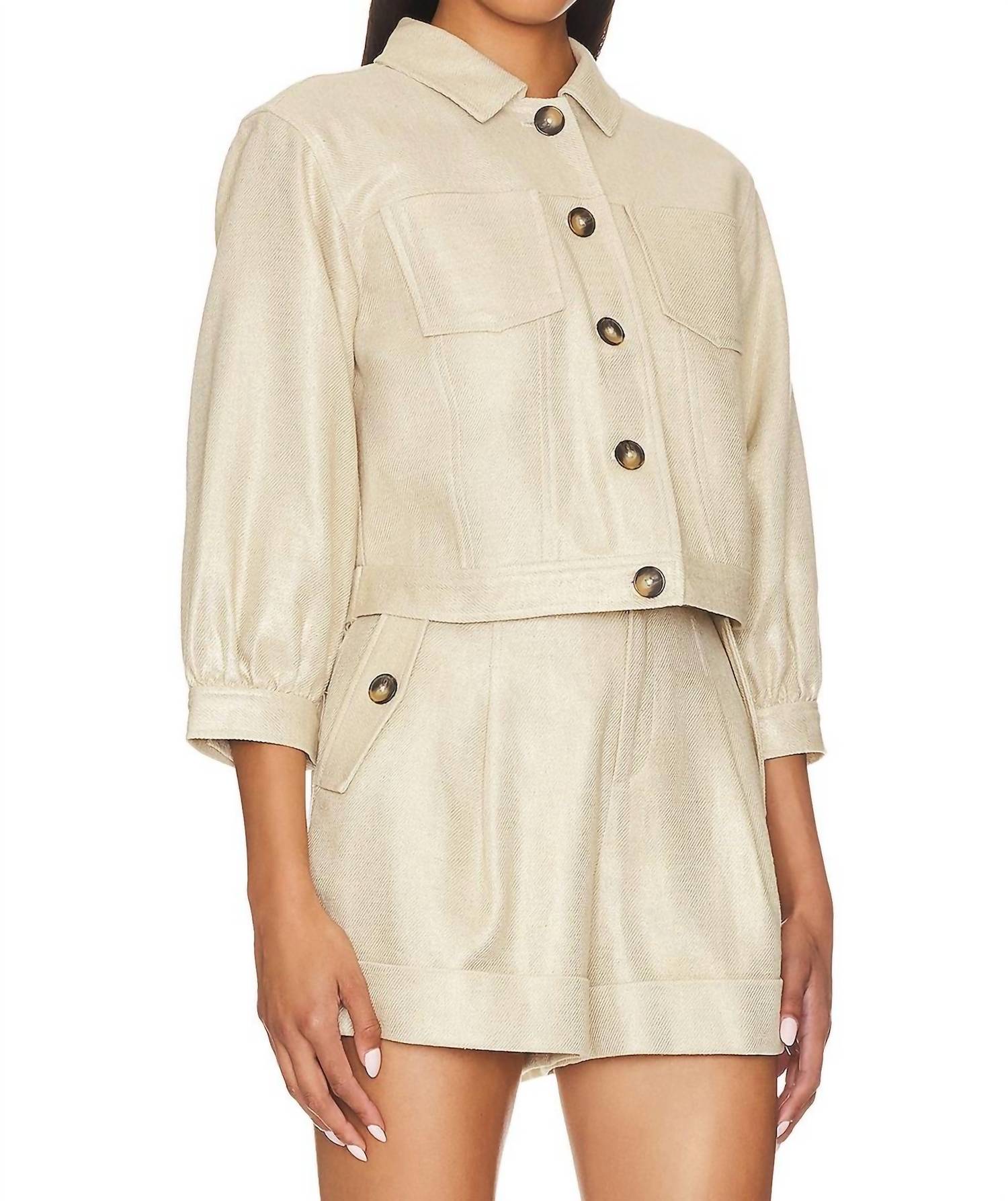 The ultimate cool-girl utility jacket. Elevate your spring wardrobe with the Cruz Utilitarian Jacket by L'Agence, a gold-hued masterpiece perfect for concert outings and New Year's Eve celebrations. Featuring three-quarter blouson sleeves with button cuffs, this chic jacket blends 75% cotton and 25% linen, offering both durability and comfort. It is made in China and includes practical breast slip pockets, ideal for your essentials. Closure: Front button closure. Care: Dry clean recommended.