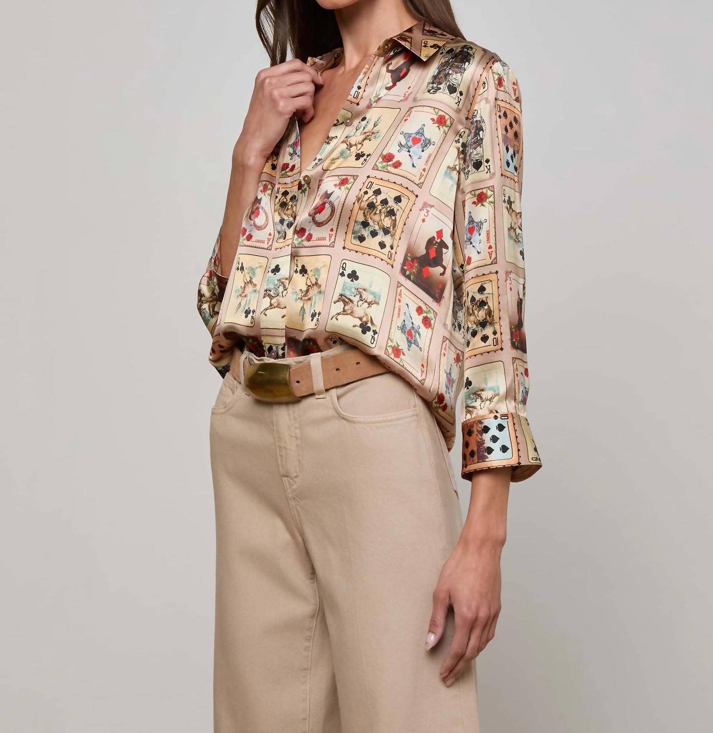 A versatile blouse that works from desk to dinner! Crafted from 100% silk charmeuse for a luxurious feel. Highlighted by a unique Tan Multi Western Cards print. With a high-low shirttail hem. Measures approximately 26" from shoulder to hem, offering a slim fit that pairs perfectly with any ensemble. Front button closure. Model is wearing a size XS (5'10" height, 32" bust, 23.5" waist, 34.5" hips).