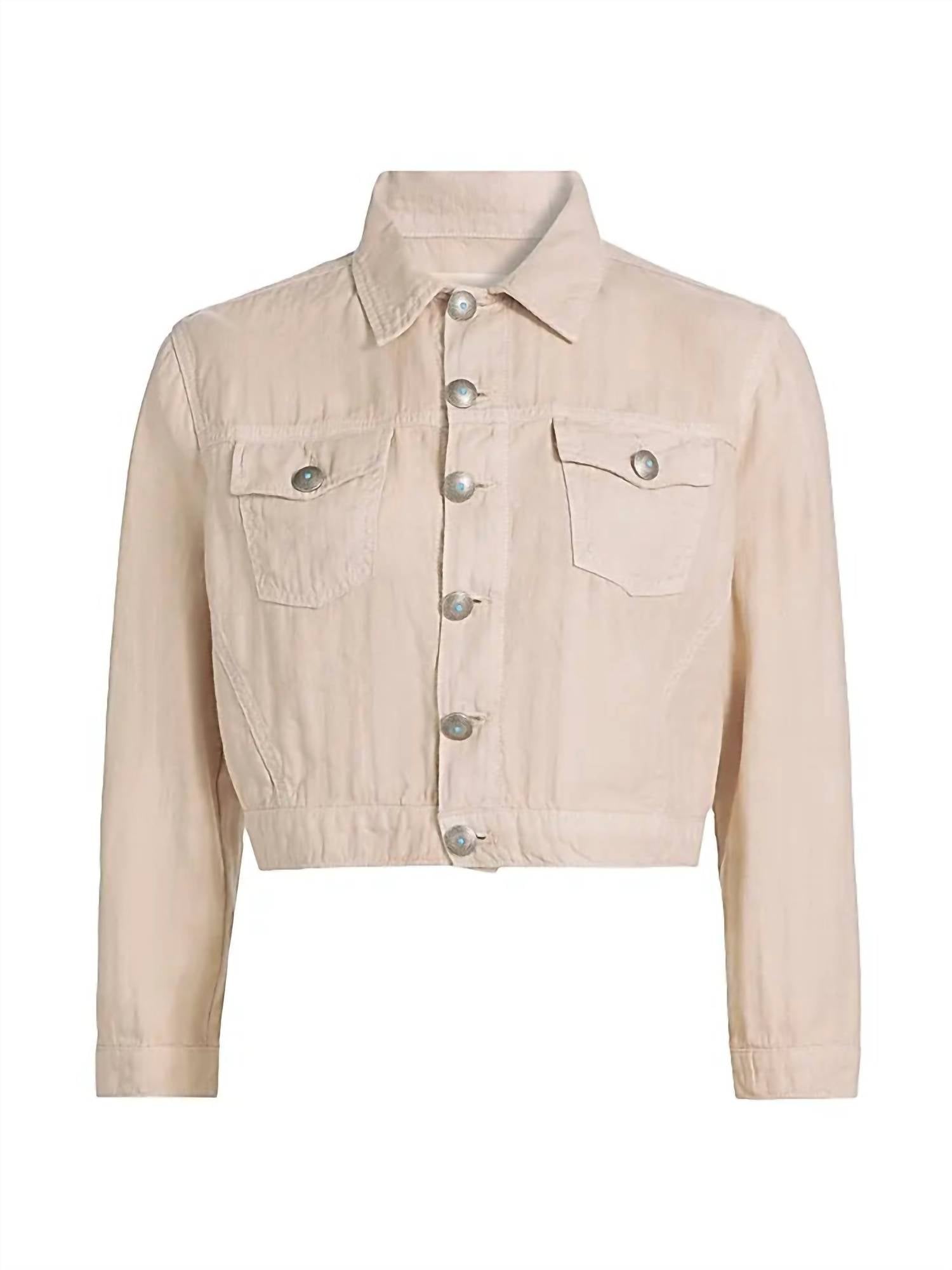 Throw this adorable jacket over just about anything for an effortlessly stylish look. The Koda Coated Cropped Jacket by L'AGENCE brings a touch of elegance with its long sleeves adorned with button barrel cuffs. Crafted from a textured linen and cotton blend, this French Vanilla piece features a cropped silhouette and ornate button details. The jacket includes chest button-through flap-patch pockets and a button-front closure, perfect for a stylish vacation look. Composition: 100% Cotton. Care: Machine wash.