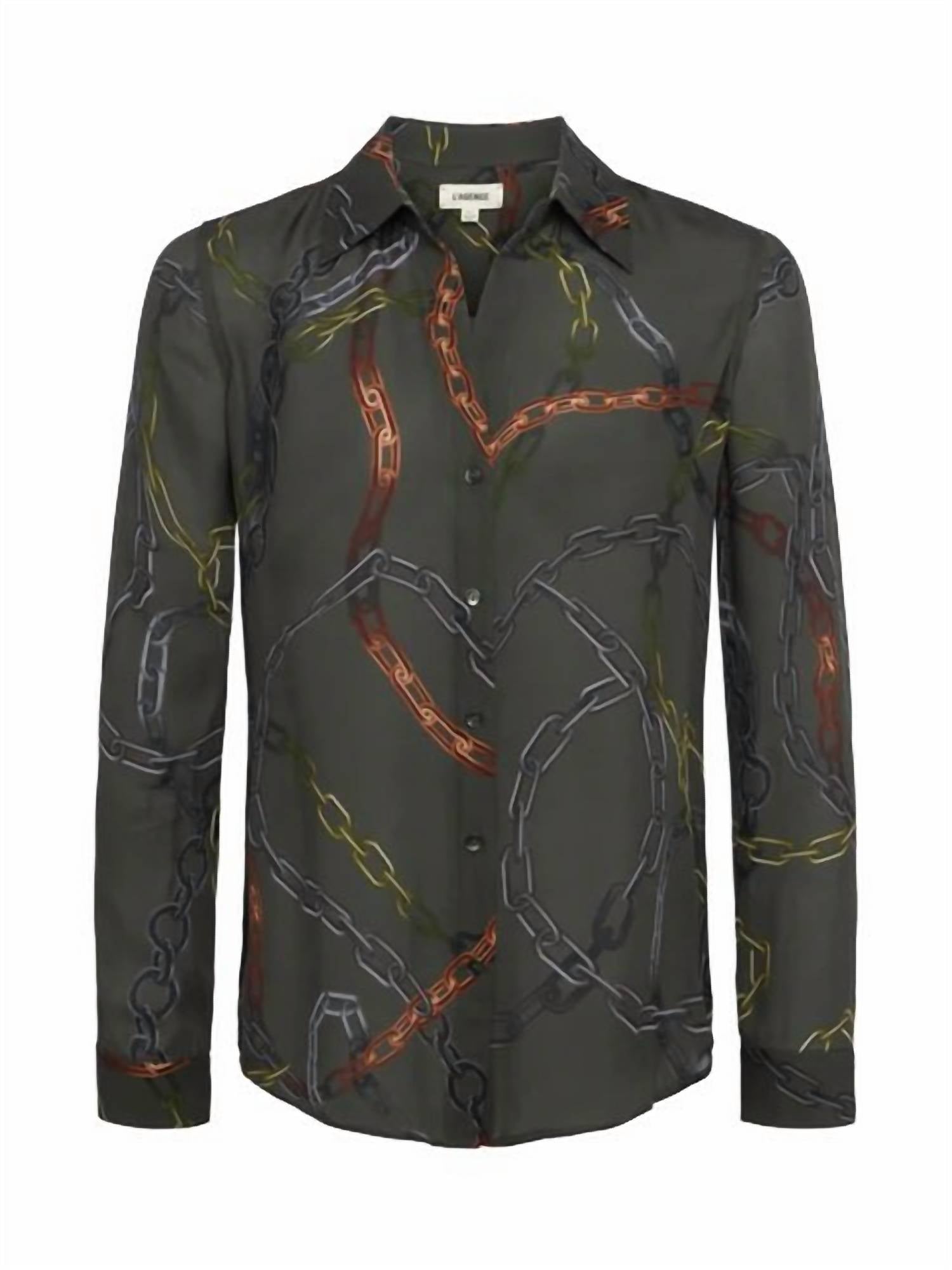 Perfectly tailored and soft to the touch. The Nina Silk Blouse by L'Agence showcases an elegant link chain print in sophisticated Army Multi. This women's button-down shirt features long sleeves and a classic collar for a timeless look. Made entirely from luxurious silk, it ensures a comfortable and sleek fit. Closure: Button closure.