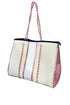 Presenting the Women's Ava Rose Gold Accents Tote Bag by Laken Paige, a luxurious and functional accessory. This imported tote is crafted from off-white canvas and neoprene, highlighted with metallic rose gold stripes, featuring silver hardware. It offers versatility with a 15" W x 12" H x 6" D body that expands to 24" W x 12" H, including a removable zippered pochette and rope shoulder straps with a 10.25" handle drop. For care, hand wash in cold water with gentle soap; do not bleach; hang to drip dry.
