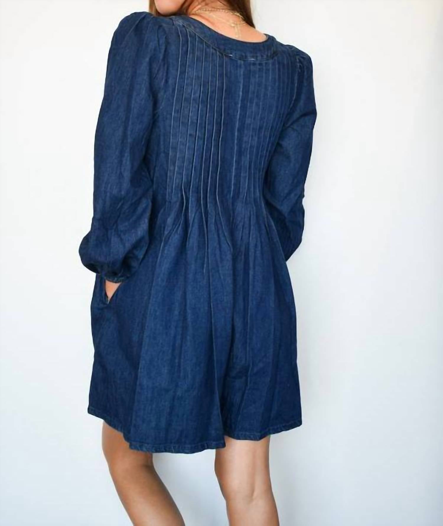It doesn't take much for this one piece to look effortlessly cool. Add some statement jewelry to dress it up, or throw on some sneakers for a more casual vibe. Introducing the Amelia Dark Wash Denim Romper by Lalavon, designed for both comfort and style with its long sleeves and V-neckline. Made from a soft cotton blend, this dress features a fashionable tie front and pleated details in a solid dark wash. With a pull-on closure. Model is wearing a size small.