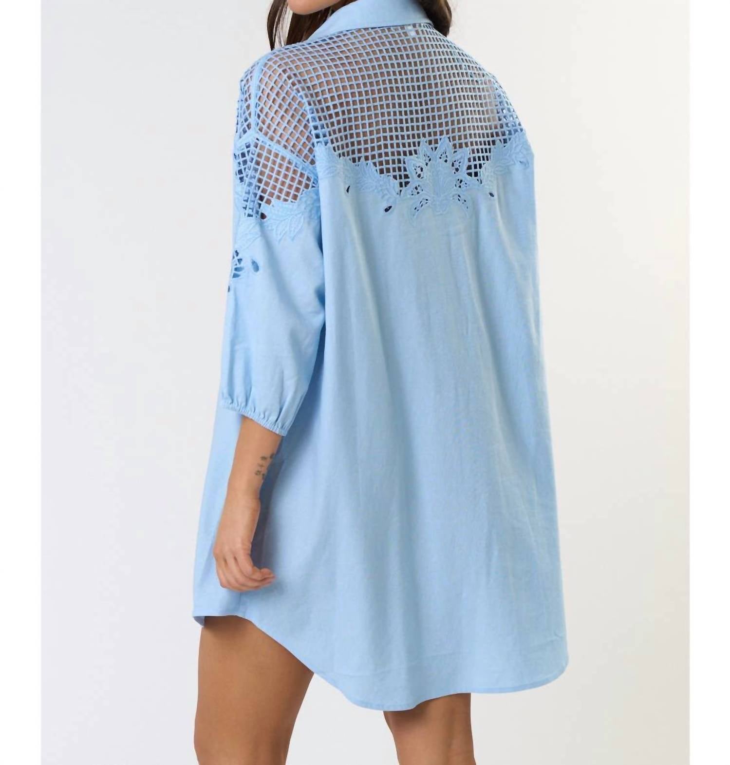 The kind of easy and flattering dress you'll be reaching for all season long. Elevate your wardrobe with the Ophelia Shirt Dress by Lalavon, a whimsical piece in light blue designed for stylish vacations. This mini shirt dress features three-quarter sleeves with an on-trend puff design and a classic collar neckline. Crafted with delicate embroidery, it offers a chic, patterned look. Closure: Button closure.
