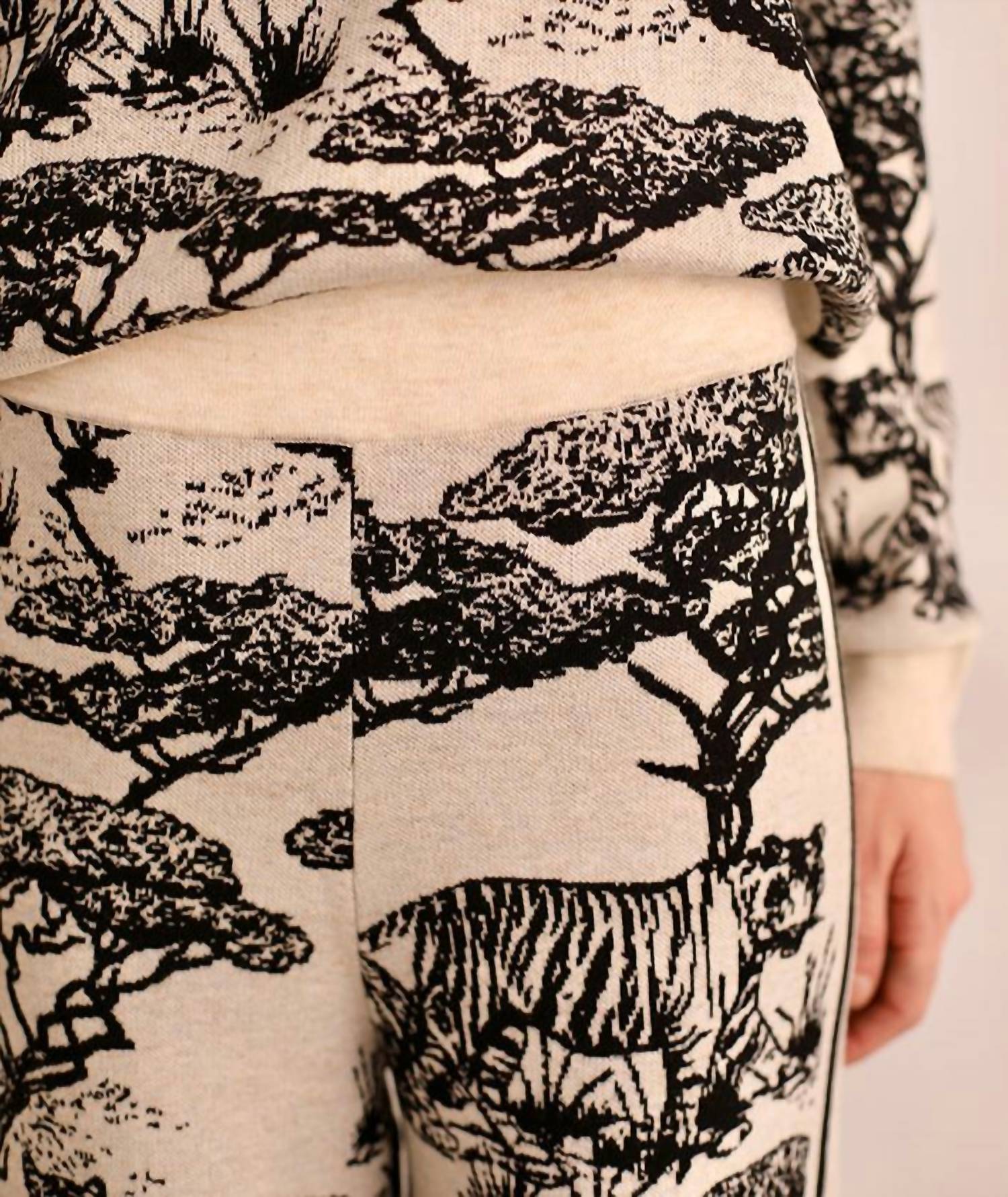 Introducing the Safari Loose Fit Pant by Las Sureñas, where exotic flair meets comfort in a black and white print. These high-rise pants feature a straight leg design that elongates the legs, enhanced by a sleek black line detail. Crafted with high-quality jacquard fabric, they boast a comfort fit perfect for summer getaways or vacation wear. Embrace the maximalist trend with this statement piece from Las Sureñas.