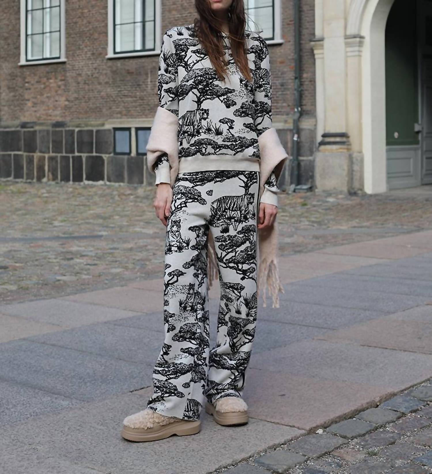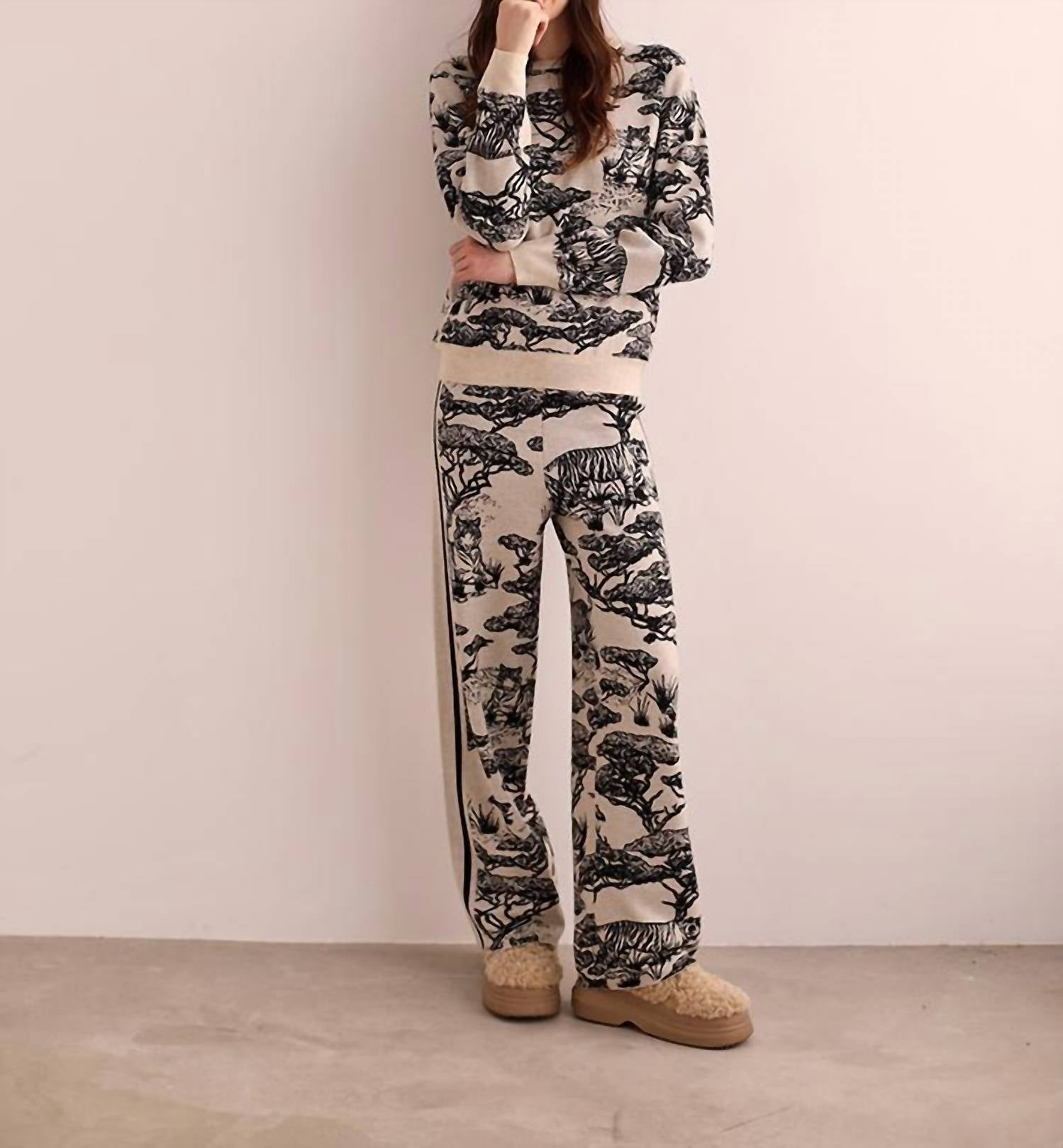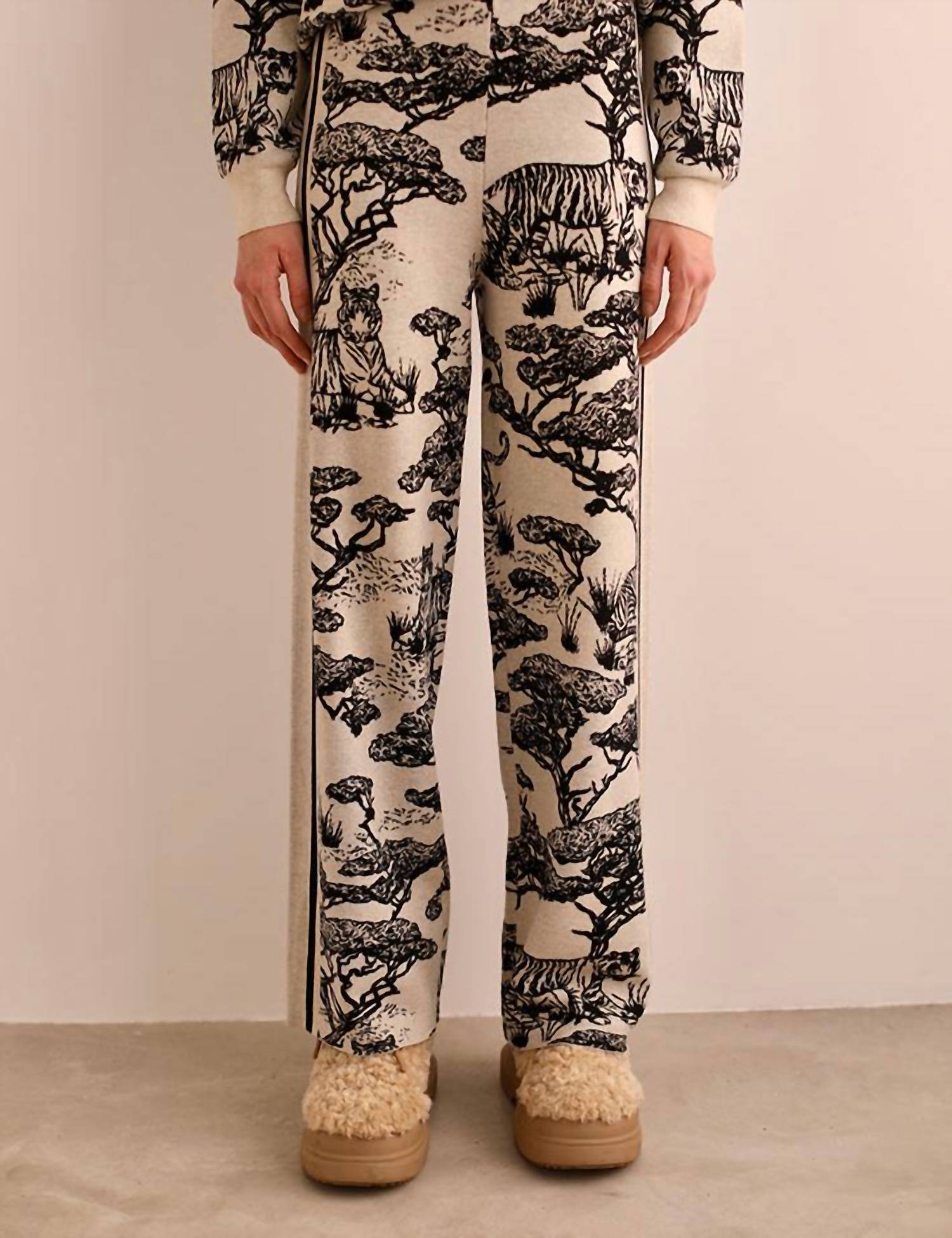 A straightleg pant that workes season after season. Dress these up with your favorite blouse or keep it casual with your go-to tee. Introducing the Safari Loose Fit Pant by Las Sureñas, where exotic flair meets comfort in a black and white print. These high-rise pants feature a straight leg design that elongates the legs, enhanced by a sleek black line detail. Crafted with high-quality jacquard fabric, they boast a comfort fit perfect for summer getaways or vacation wear. Embrace the maximalist trend with this statement piece from Las Sureñas.