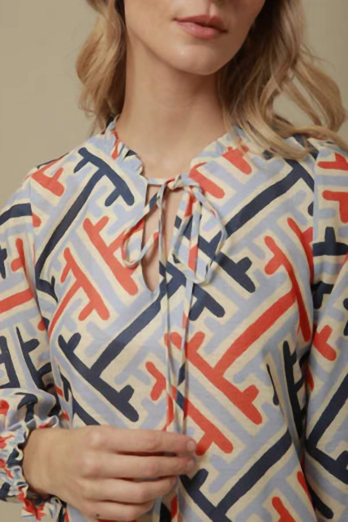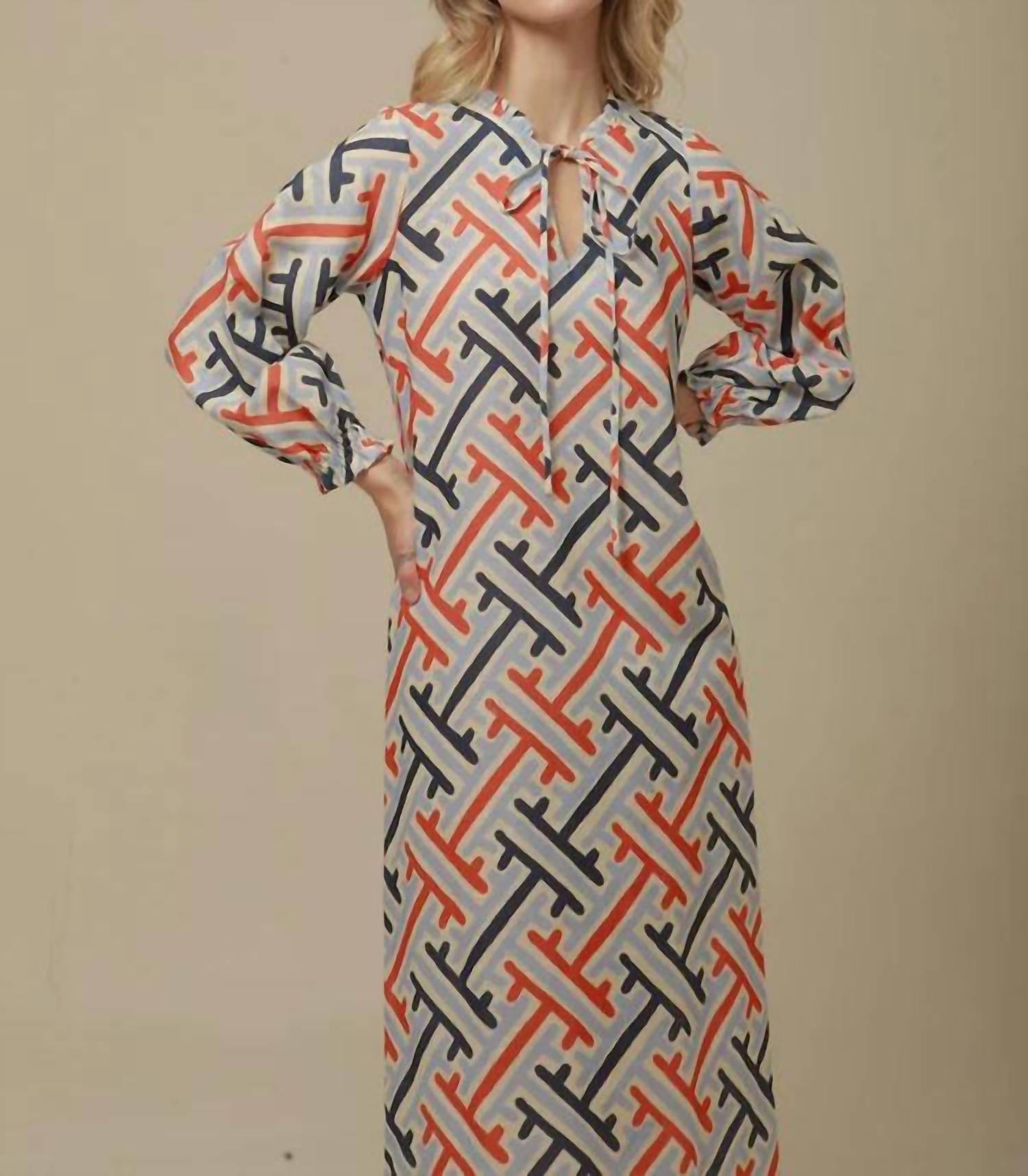Cute and comfortable, this long sleeve dress has it all. Introducing the Beatriz Dress by Lavi, the epitome of chic versatility for the modern woman. This midi dress features full-length sleeves and a relaxed shift silhouette, enhanced by a vibrant geometric print in coral, navy, and soft blue. The feminine touch of a keyhole neckline with a tie closure adds sophistication to its casual boho chic style, perfect for both weekday sophistication and weekend ease. Crafted for Fall, this dress is an ideal choice for occasions like a Thanksgiving holiday party.