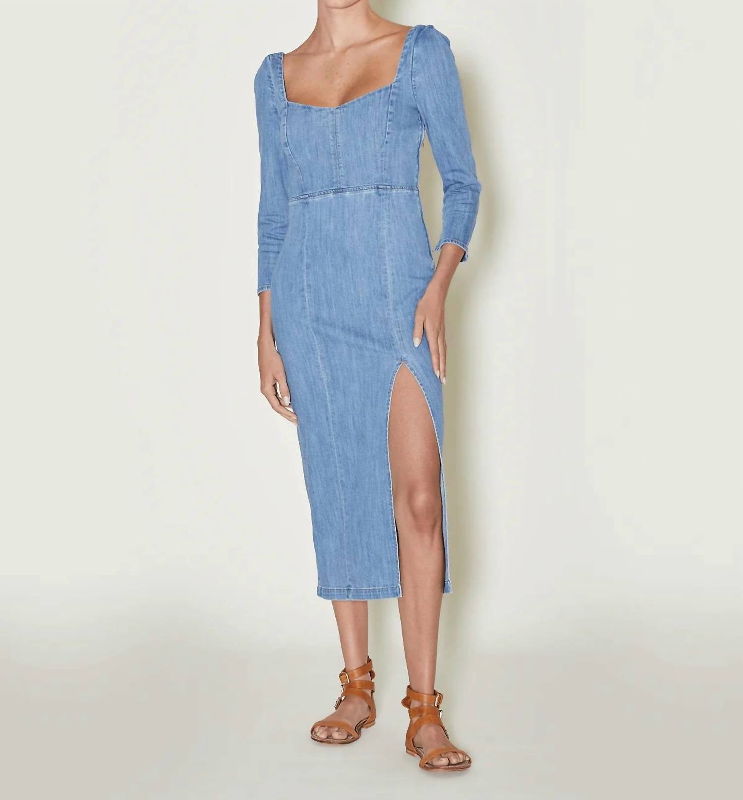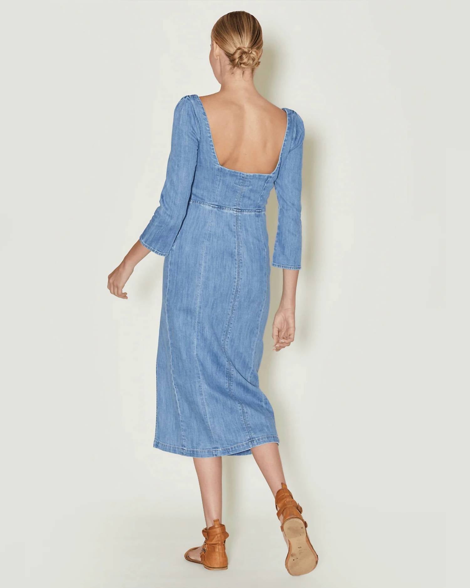 The perfect length dress does exist. The Tallulah Midi Dress by Le Jean brings a playful twist to classic denim, perfectly suited for any dinner party or spring outing. With its three-quarter sleeves, bodycon silhouette, and flattering square neckline, this dress is crafted from a comfortable cotton blend with just the right amount of stretch for the perfect fit. The Daisy Dusty Blue color adds a chic touch, while the cheeky front slit detail and zip closure enhance its trendy 90s fashion appeal. Made without pockets and featuring a mid-weight, soft fabric, it's designed to fit true to size, with a center front length of 33''/84cm. Composition: 96% Cotton, 3% EME, 1% Elastane. Care: Machine wash cold. Model is 5'8'' and wears a size small.