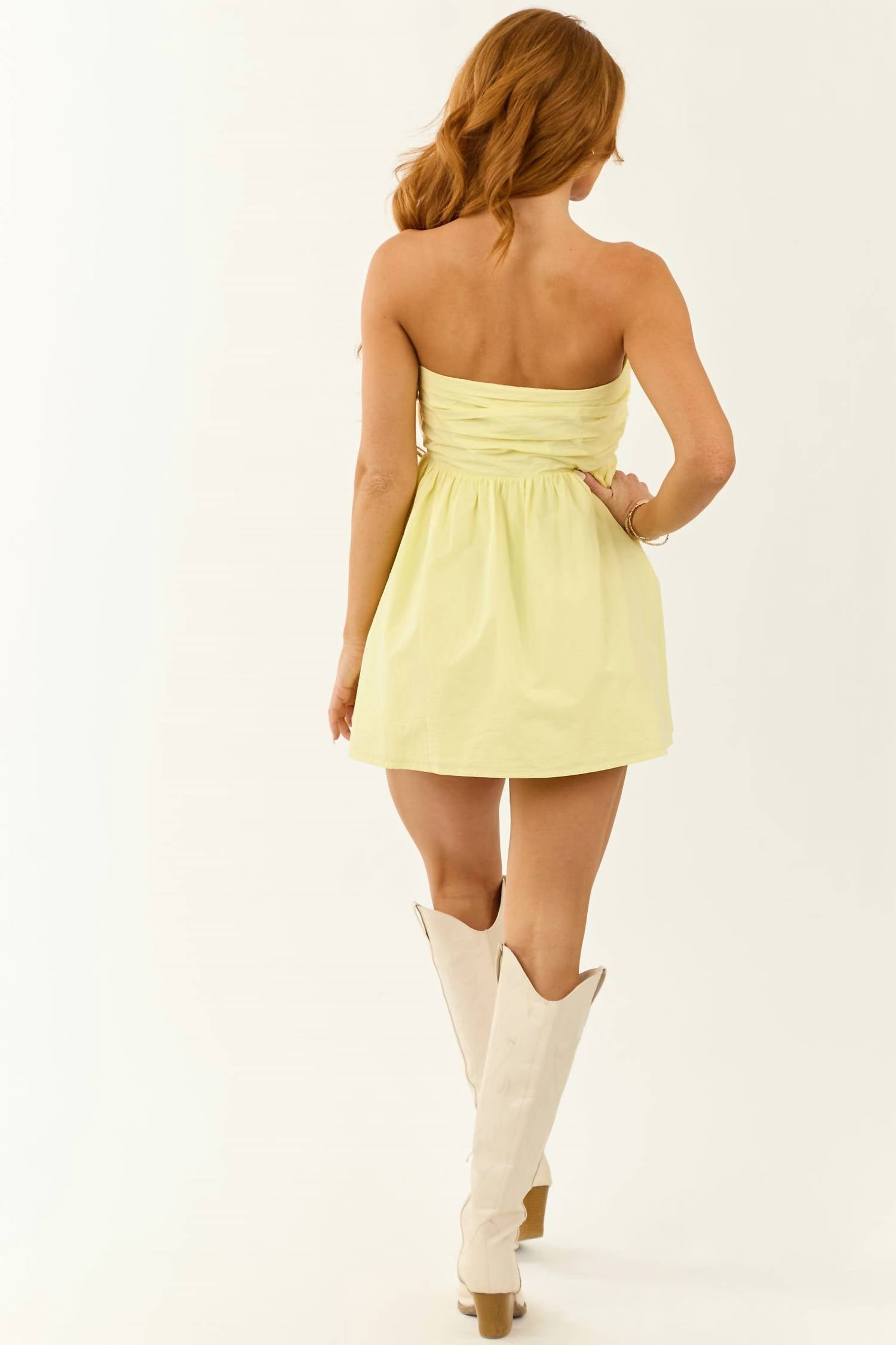 The kind of easy and flattering dress you'll be reaching for all season long. Introducing the Strapless Pleated Mini Dress by LE LIS, a delightful choice for sunny days in light yellow. This strapless, ultra-mini length dress is crafted from non-stretchy, breathable 100% cotton and features a fit and flare silhouette. It ensures a secure fit with an adhesive strip on the bust and a hidden side zipper with a hook and eye closure. Imported and measuring 25 inches in length (size S), this solid-patterned dress is lined for added comfort.