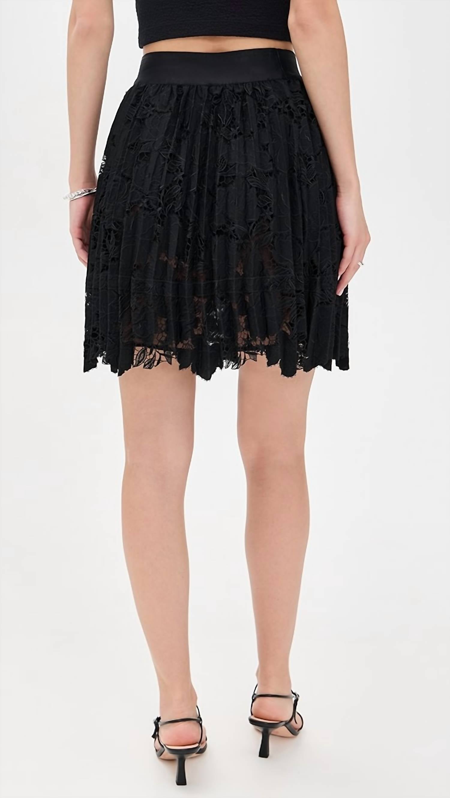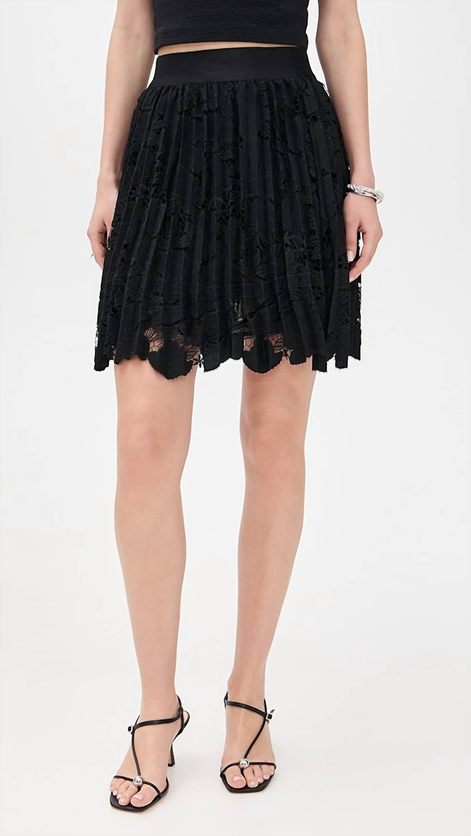 Discover the Mini Pleated Skirt by LE SUPERBE, a chic black skirt featuring a beautiful patterned design. Crafted from lightweight, non-stretch lace, this garment is made from a shell and lining of 100% polyester and spans 19 inches in length. It is designed with an elastic waistband and convenient pull-on closure for comfort and ease. Made with care, this skirt should be dry cleaned to maintain its elegant appearance.