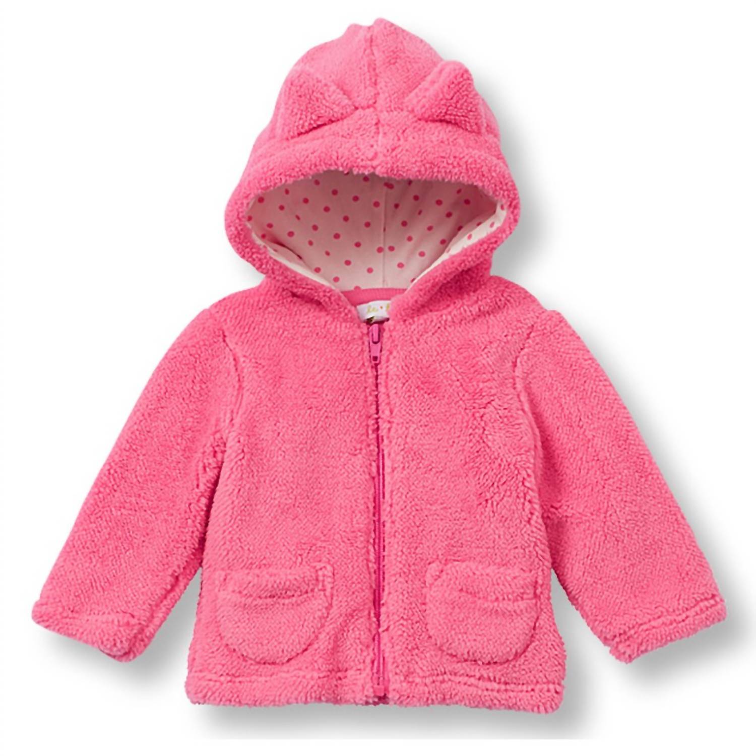 Like warm kitten snuggles in plush jacket form! This super-cute and extra-plush jacket with adorable kitten ears will make playtime fun for your baby girl all fall and winter long. Dual patch pockets, a hot pink zipper, and a pink on white polka dot lining complete the look. 100% polyester outer and 95% Cotton/5% Spandex lining. Machine washable. Size is 6 mos.
