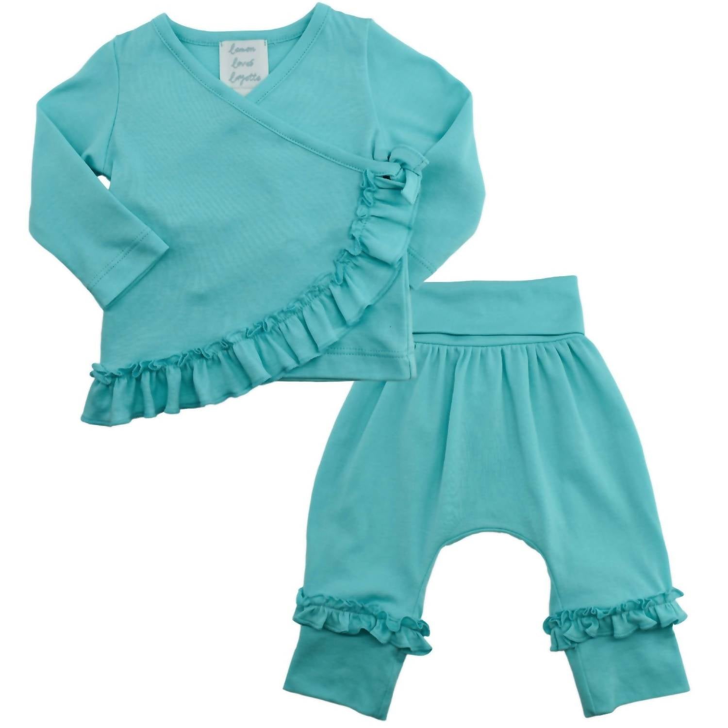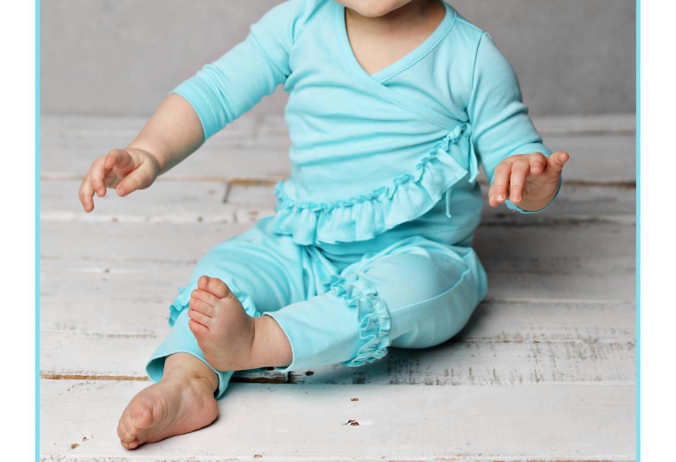 Lemon Loves Layette introduces a brand new style and color, blue tint, based on feedback from mom's who wanted to see a 2 pc set. So, this precious "Adley" set was "born". The kimono style criss-cross top is accented in ruffles that trim the hem of the top and goes up the bodice to tie and secure in a little bow. Pull up leggings have a comfy waistband that can fold up or down and are also trimmed at the ankles in ruffles. So sweet! This is a lovey set for any other special occasion, including "Take Me Home" in the 0-3 mos. size. Consider pairing the Lily Pad headband (shown in Adley Pink set photo). A great addition to her layette and perfect baby shower gift that mom would just love for her baby girl.