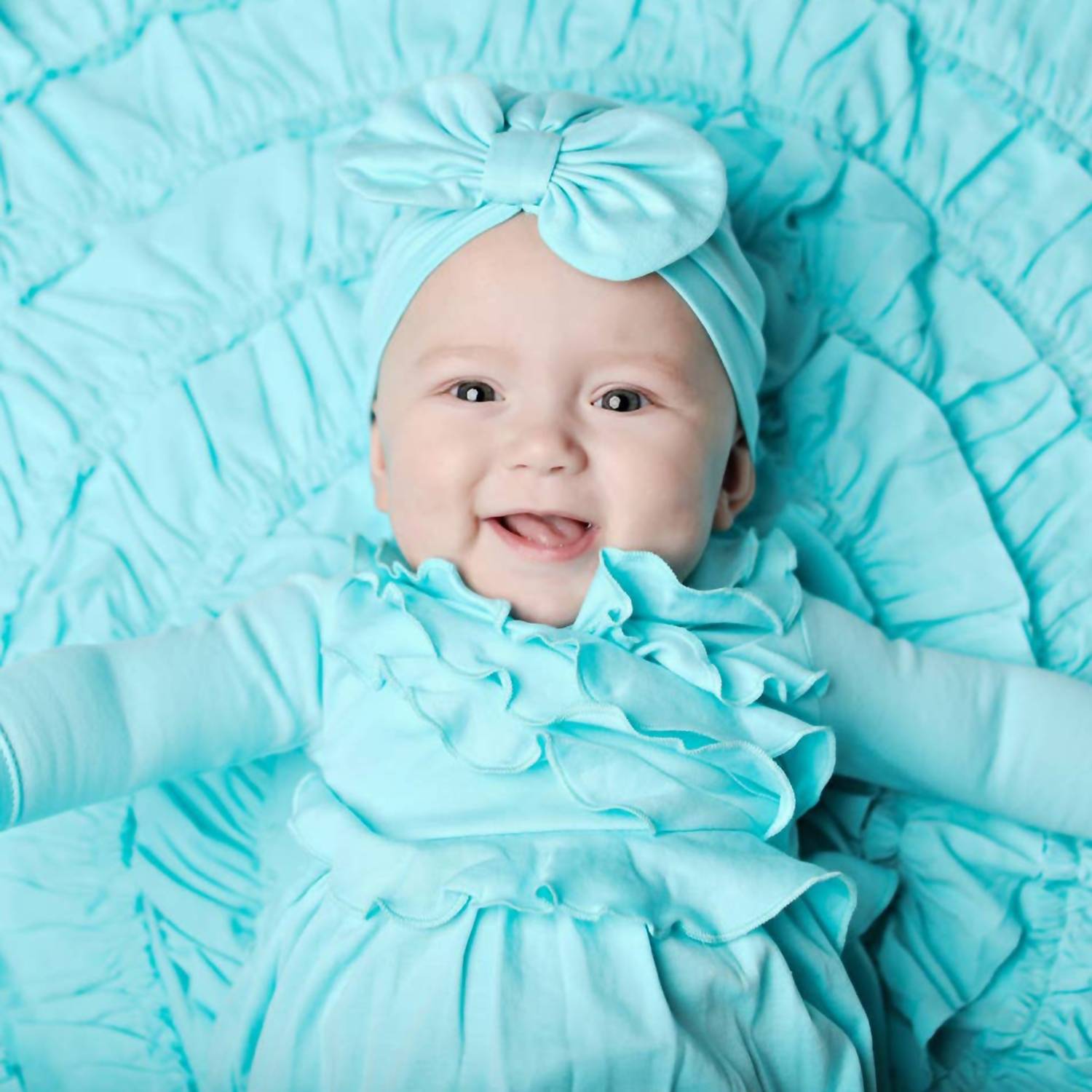 Brand new from Lemon Loves Layette. The "Bow" hat in blue tint is simply precious. And, it pairs just perfectly with everything blue tint from Lemon Loves Layette newborn and baby girl collections. Hat is 100% cotton and features a great big blue tint bow in the center. The "Bow" hat is a great baby shower gift and perfect for baby's first photo, too. NOTE: SIZE IS 6-12 MOS. NOT 6-9 MOS.