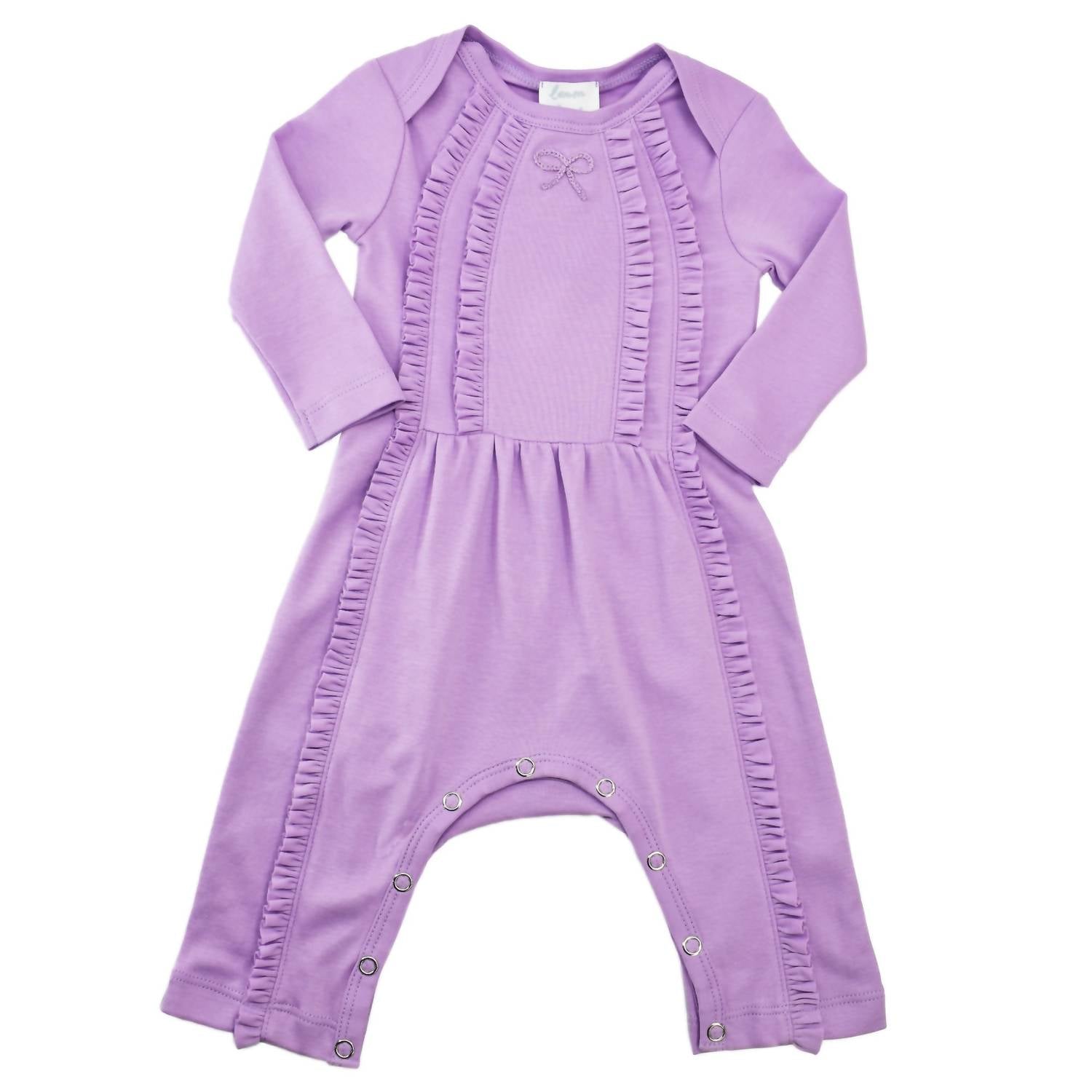 We just love this sheer lilac, Lemon Loves Layette Victoria Romper. This romper is so sweet as it features a hint of Lemon Loves Layette signature ruffles. The bodice has a LapT expandable collar for easy dressing and baby's comfort. And, it features two vertical rows of ruffles with a precious little bow in the center. The outside ruffles go all the way down to the ankle. All Lemon Loves Layette garments are made with the finest, softest, 100% Peruvian cotton. To complete this adorable look, consider the sheer lilac Lily Pad or Rose Headband or the Bijou Hat.