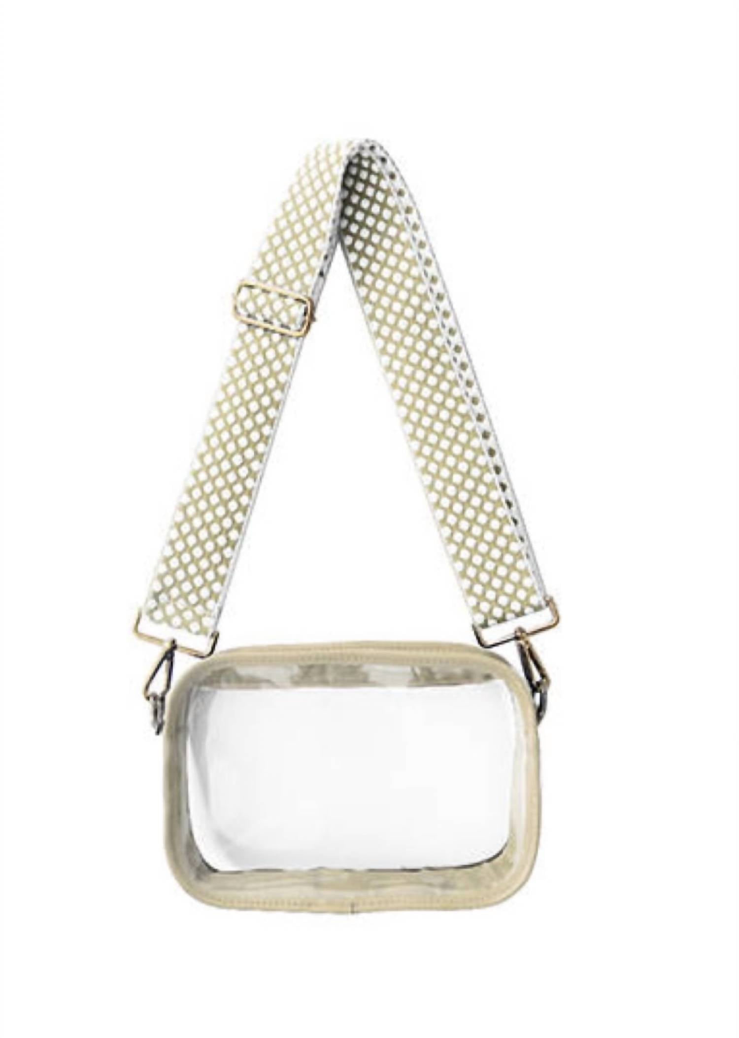 A casual and cute take on everyone's favorite crossbody bag. The Women's Cameron Stadium Bag With Zig Zag Strap by lemonbella is your perfect companion for events, proudly meeting all stadium regulations. Made from durable clear PVC, it offers style and functionality, complete with an adjustable crossbody strap. This desert-toned bag is easy to maintain with spot-cleaning. Get ready for your next adventure with this versatile accessory.