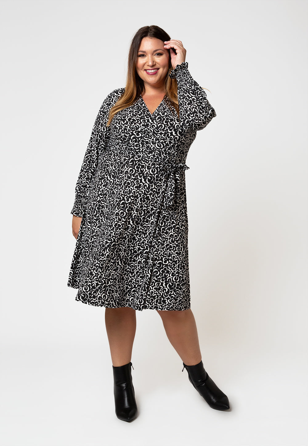 Leota Women's Long Sleeve Perfect Wrap Midi Dress in Graphic Gardenia (Curve) White