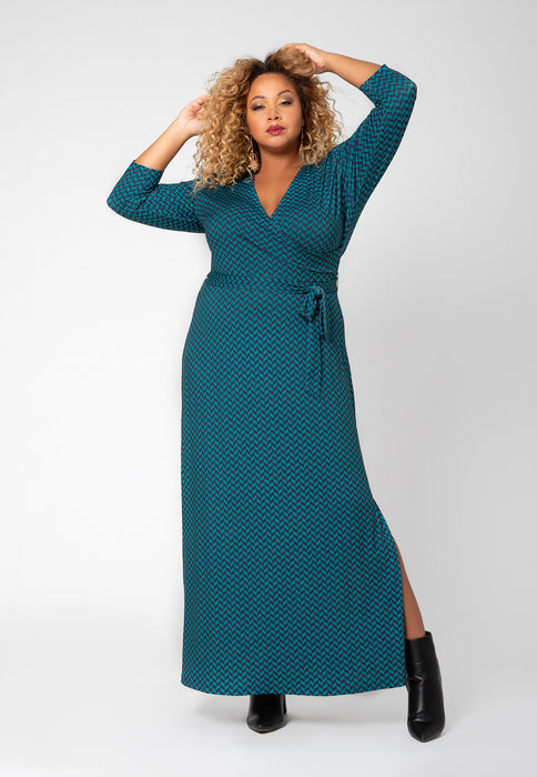 A Leota crowd favorite Perfect Wrap dress reimagined with a glam full-length maxi skirt| V-neckline and a bracelet sleeve| There's not a print or person that doesn't suit this dress| trust us|Ê Leota's Essential Jersey is the ultimate easy-wear| easy-care fabric with the perfect blend of fit| comfort and stretch