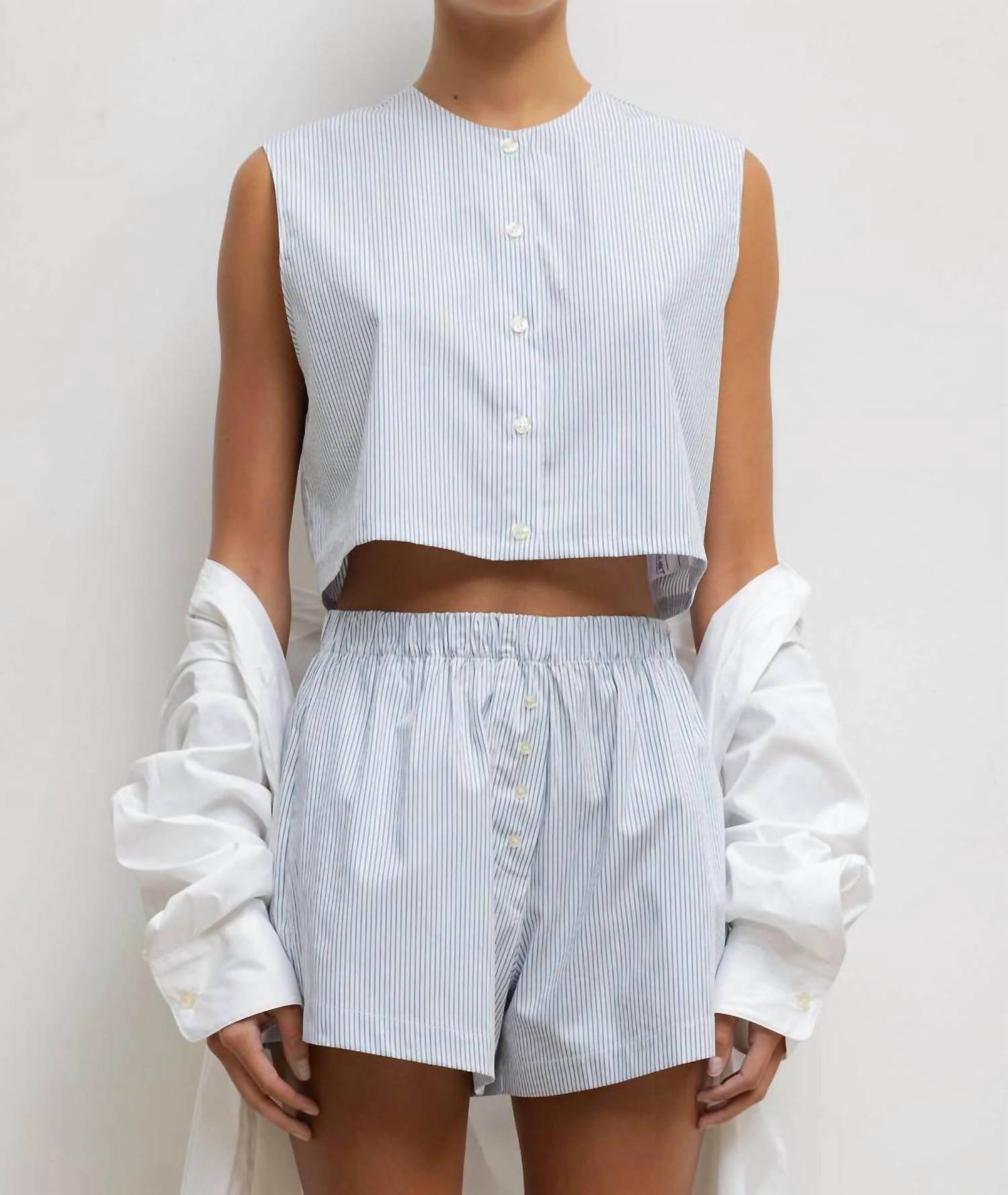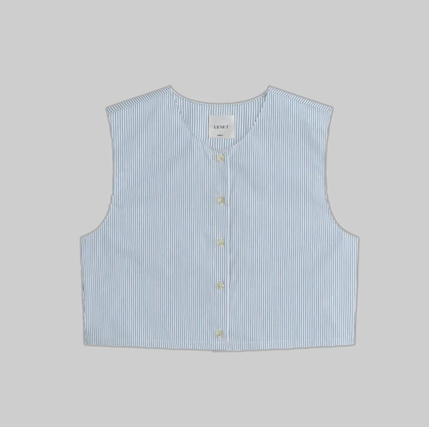 Show a little skin in this cute and casual crop top. Meet the Yoshi Crewneck Vest by LESET, a stylish sleeveless piece perfect for seaside adventures. Crafted from 100% cotton, this vest features a charming sea stripe print, a crew neckline, and an exposed button closure, all in a trendy cropped length. Embrace the minimalist trend with this true-to-size garment, ideal for a summer holiday party.