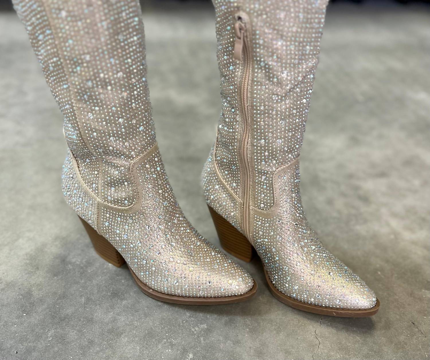 These over the knee boots are equal parts classic and cool. Step into glamour with the Bring Ya To Your Knees Boots by Let's See Style, featuring a Western-inspired, over-the-knee design. Adorned with dazzling rhinestone detailing, these champagne-colored boots are both striking and stylish. With a comfortable 3" heel and a 21" length from ankle to boot top, they ensure an impeccable fit and quality. Perfect for making a bold statement, these boots are a must-have in any fashionable wardrobe.
