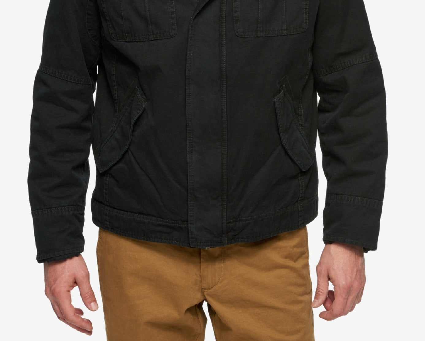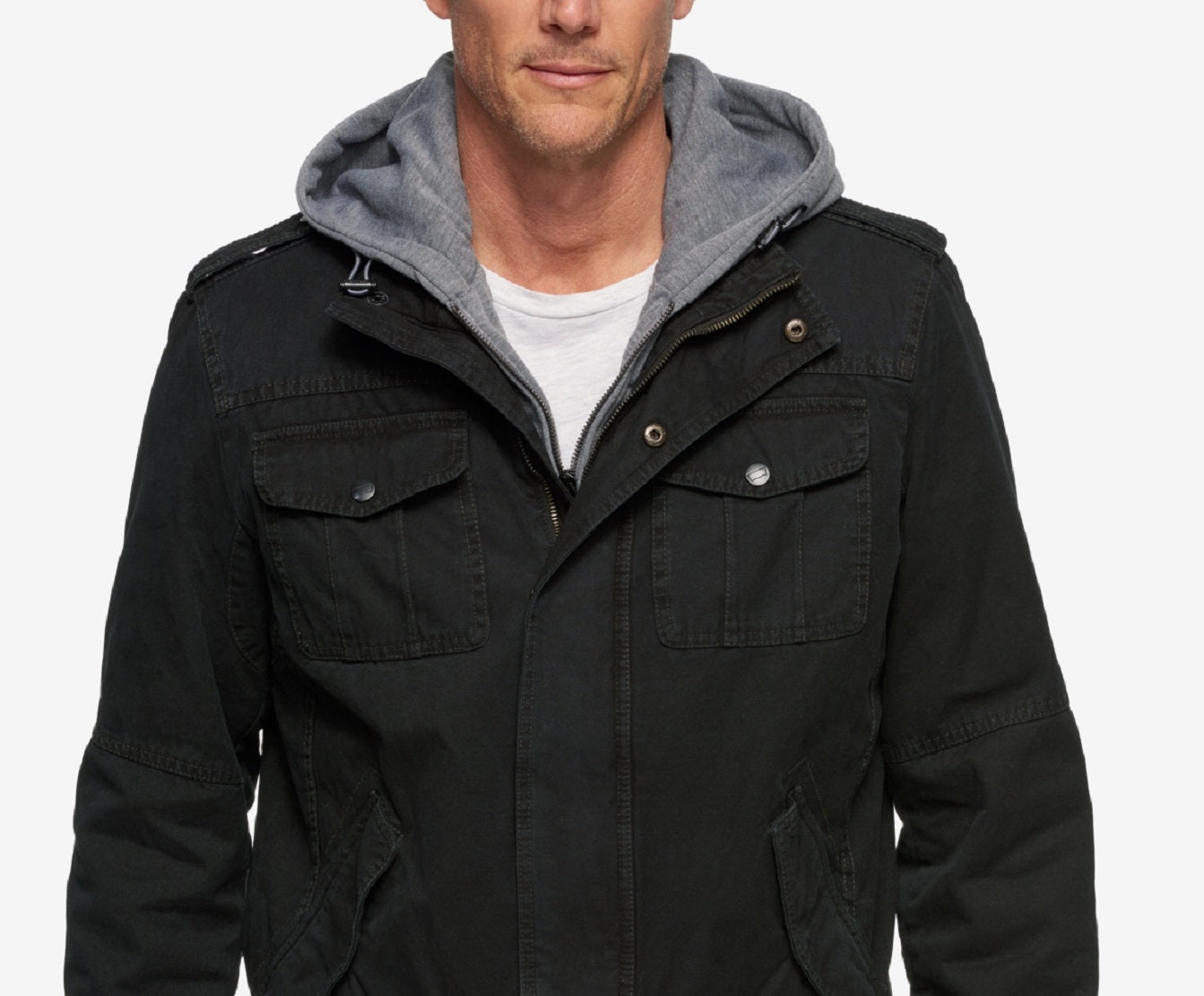 Adjustable snap cuffs|Attached jersey bib & hood|Epaulettes at shoulders|Two front slant pockets; two chest flap pockets with snap closure|Imported|Full-zip and snap closure