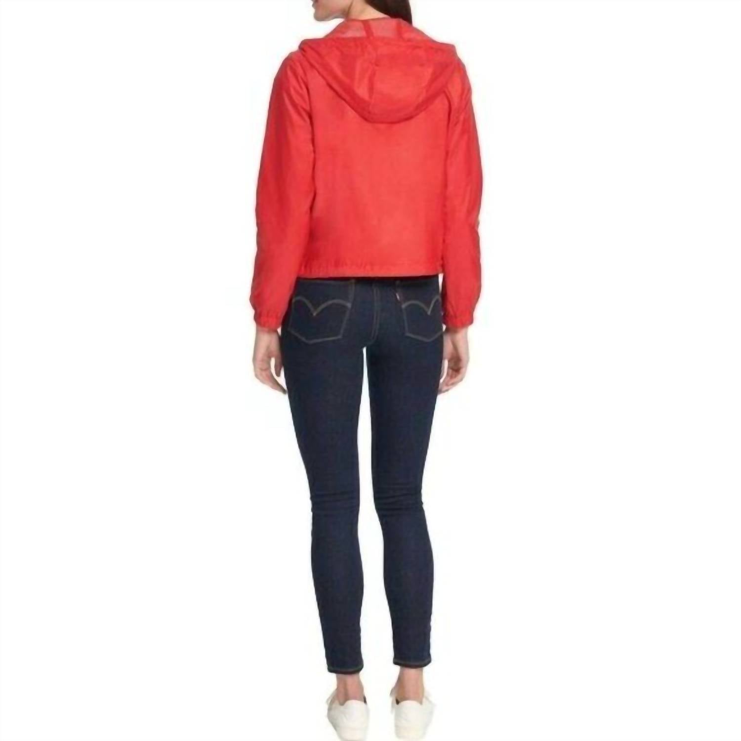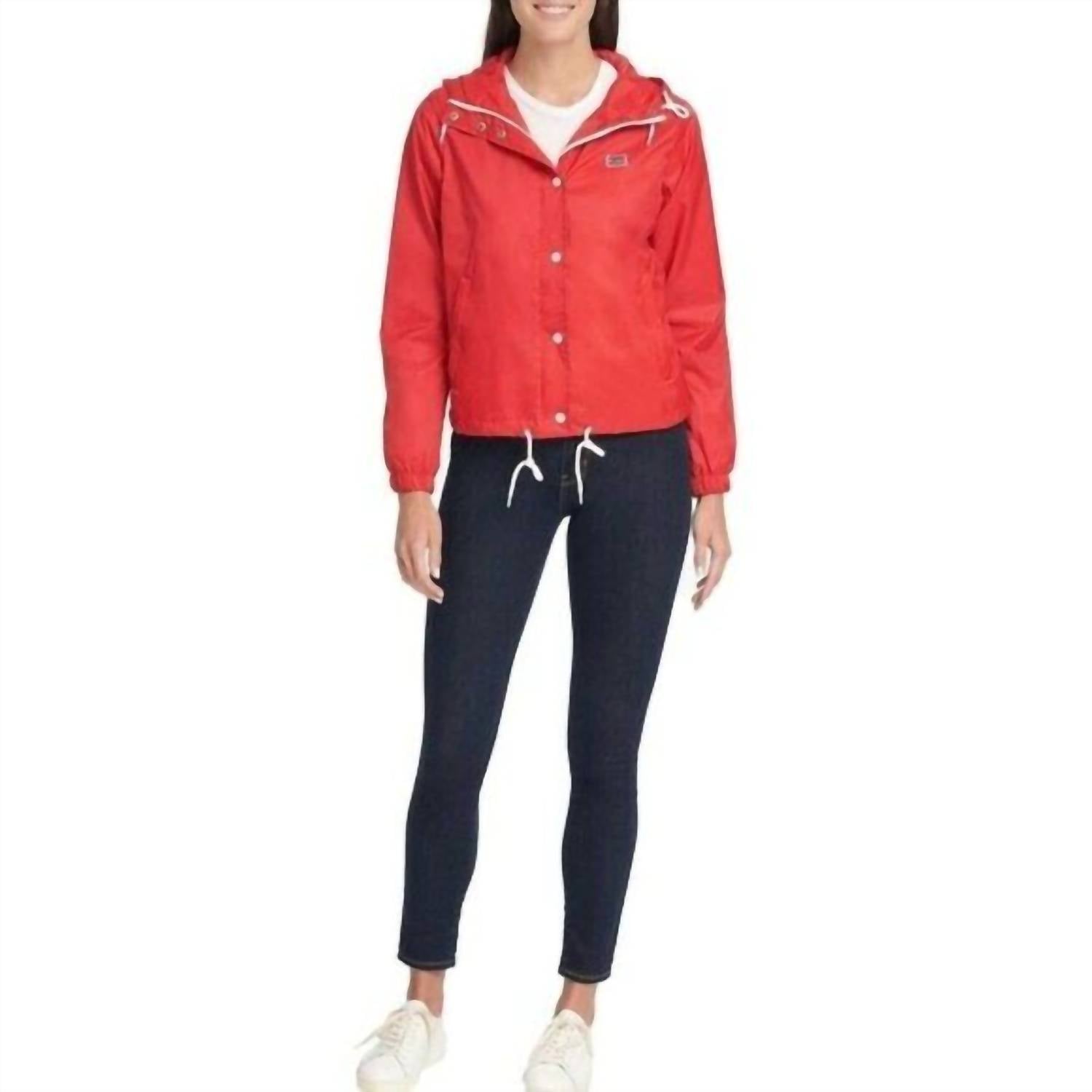 This utility jacket is the perfect combination of cool and feminine. Stay stylish and dry with the LEVI'S Nylon Windbreaker Hooded Zip Up Rain Jacket. This red utility jacket features long sleeves, measuring 24.5", crafted from 100% nylon and is designed in a modern cropped style with a total length of 24". It boasts a practical front zip closure with a snap placket to combat rainy days, along with an adjustable drawstring hood and front zip pockets for added functionality. Machine washable and water resistant, this jacket is perfect for tackling tough weather with ease.