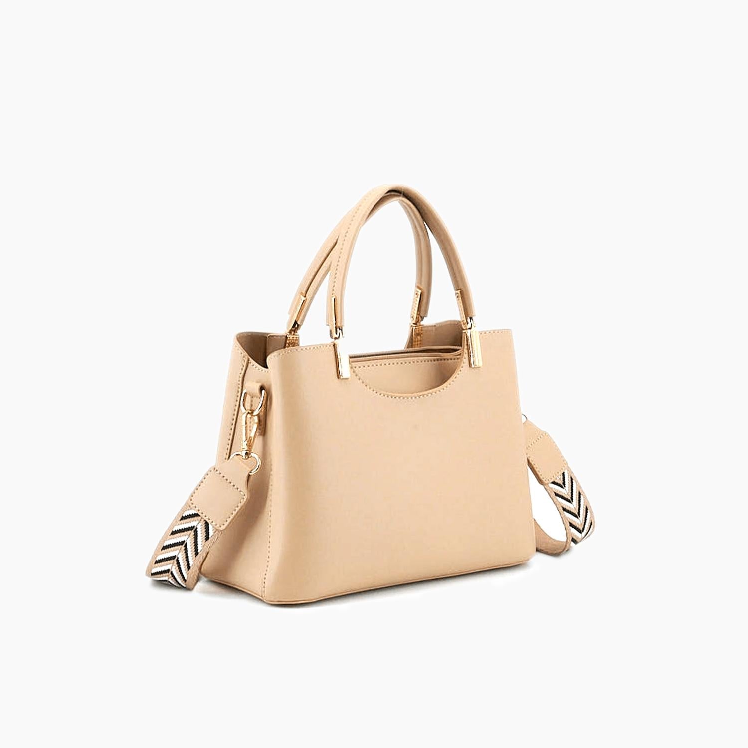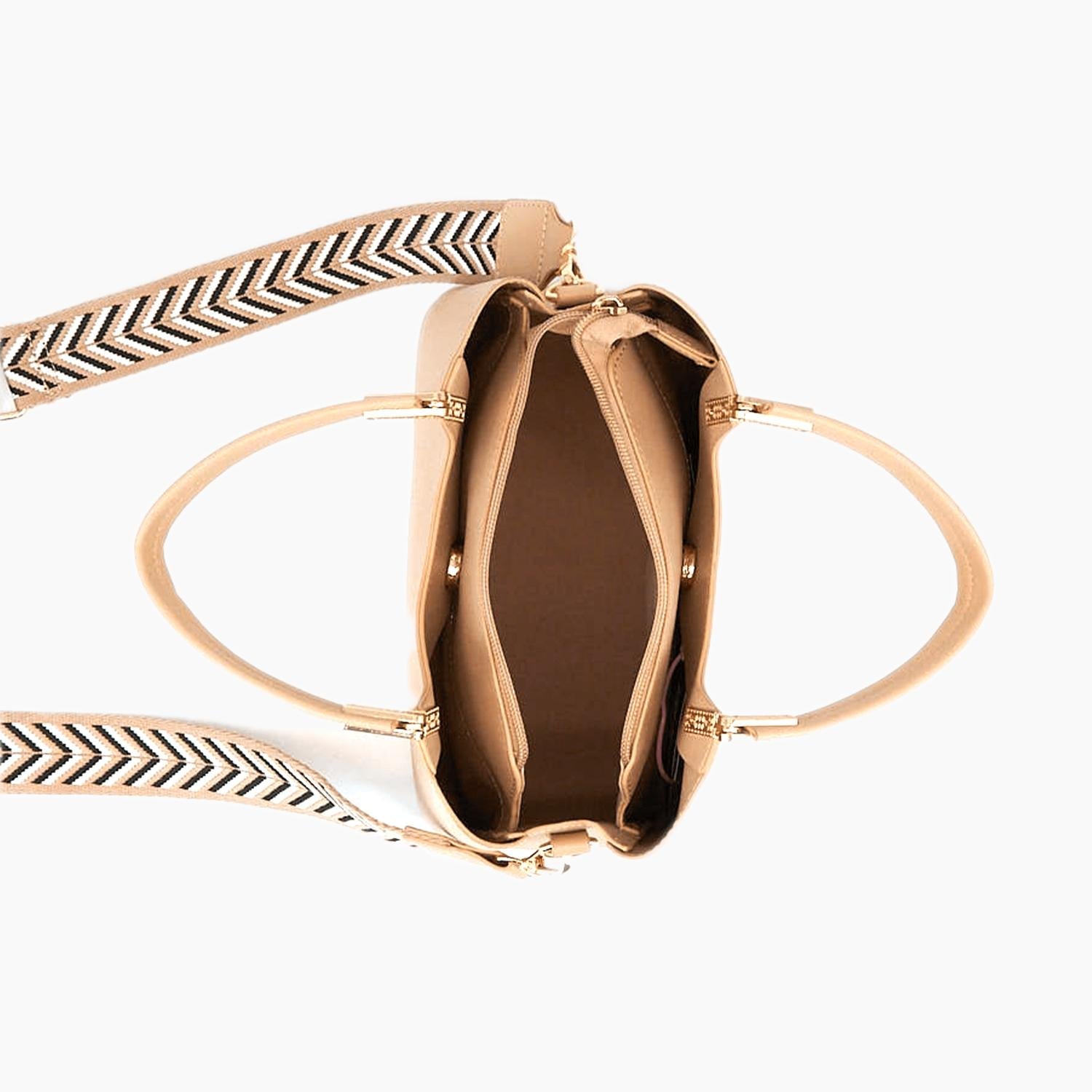 This crossbody bag will be your go-to bag of the season. Discover the Women's Ava Simpler Times Vegan Crossbody Bag by Like Dreams, a chic addition to your collection. This spacious bag crafted from smooth vegan leather in beige features a patterned detachable strap for a personalized style statement. With dimensions of 10 inches wide, 7 inches high, and 4.5 inches deep, it includes zipper and dual magnetic snap closures for secure storage, complemented by elegant gold hardware. The interior boasts a polyester lining, making it a practical and fashionable choice for everyday use. Total Weight: 17.95 oz.