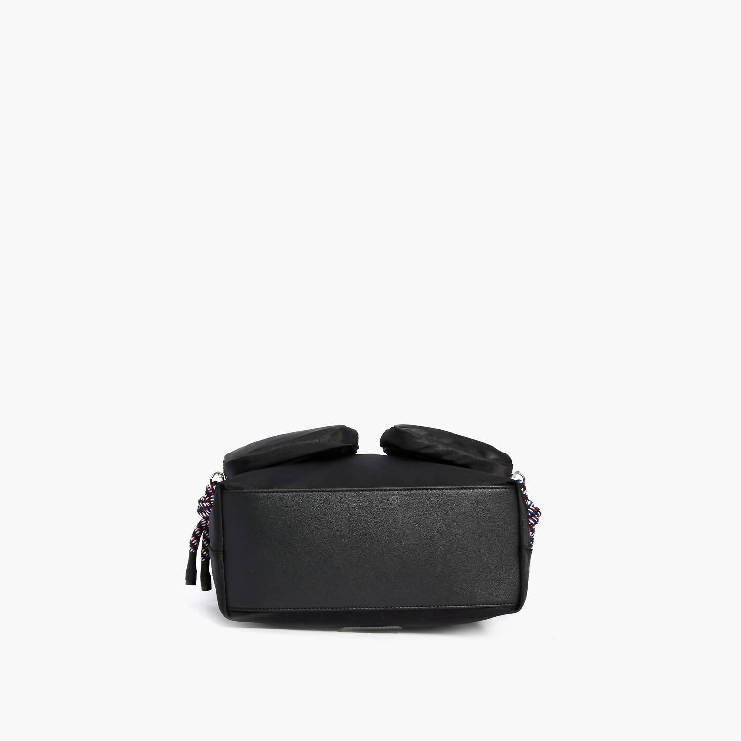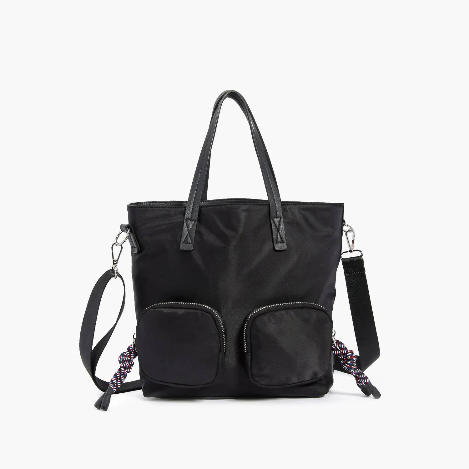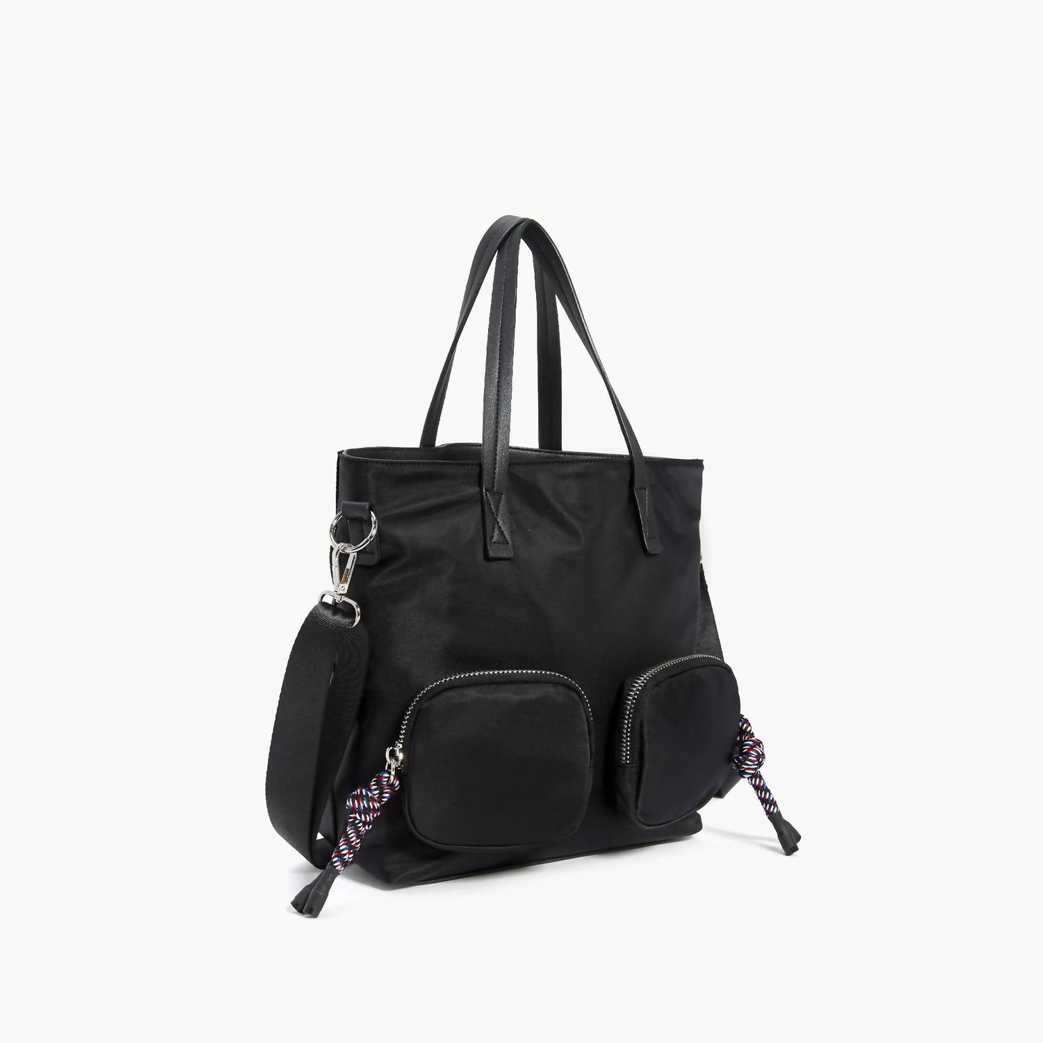 The carry-all tote bag of the season. Get in vacation mode with this perfectly sized tote bag that is the perfect accessory for beach days, pool parties, or sunset dinners. Discover the Women's Full Force Utility Tote Bag by Like Dreams, a stylish and functional tote in classic black. Crafted from durable nylon with vegan leather detailing, this bag features a spacious interior with an inner laptop pocket and two front zipper pockets with twisted tassels for added flair. The bag measures 13.5" in width, 11.5" in height, and 4" in depth, and weighs 20.32 oz. With a top handle drop of 6.5 inches, and an adjustable/detachable strap, it offers versatile carry options.