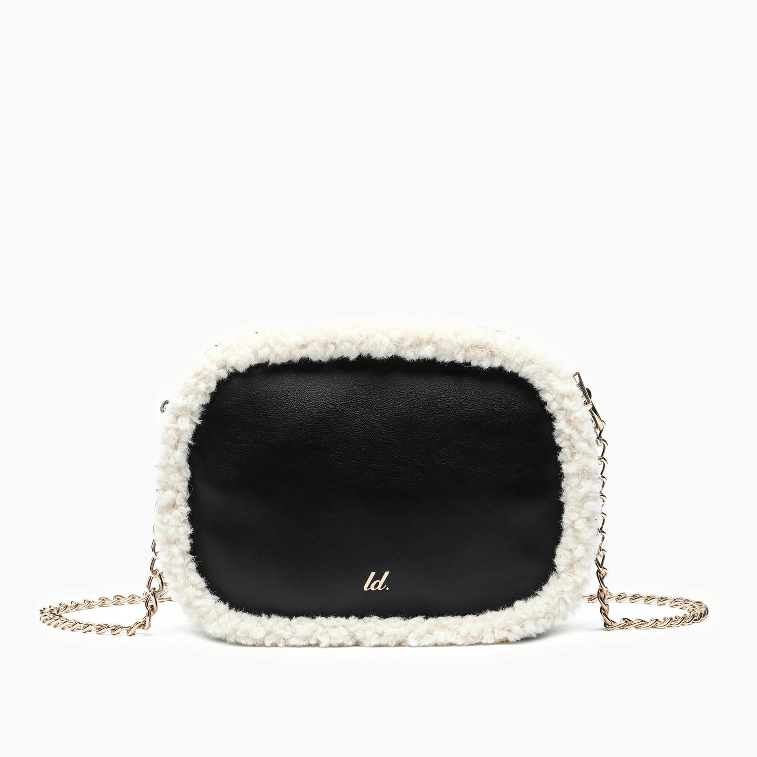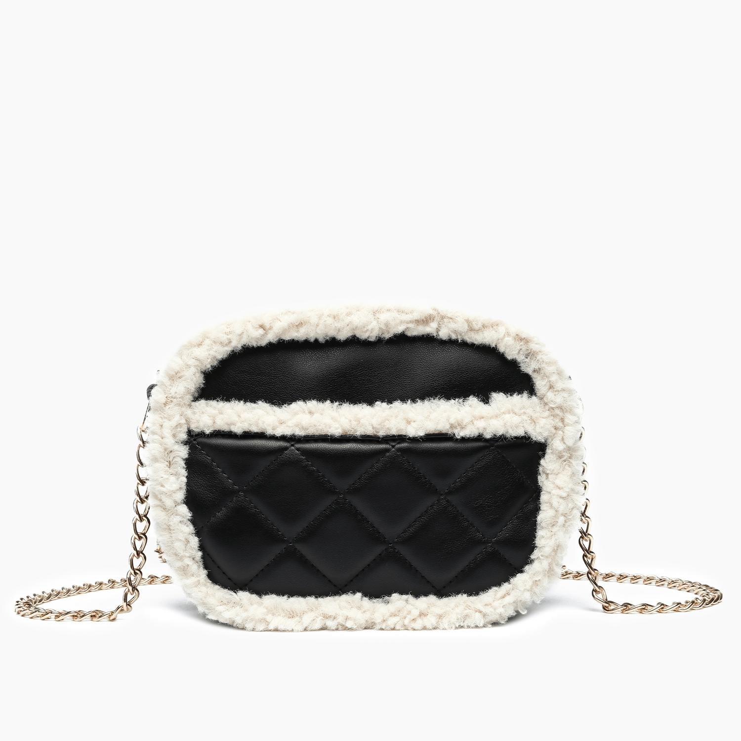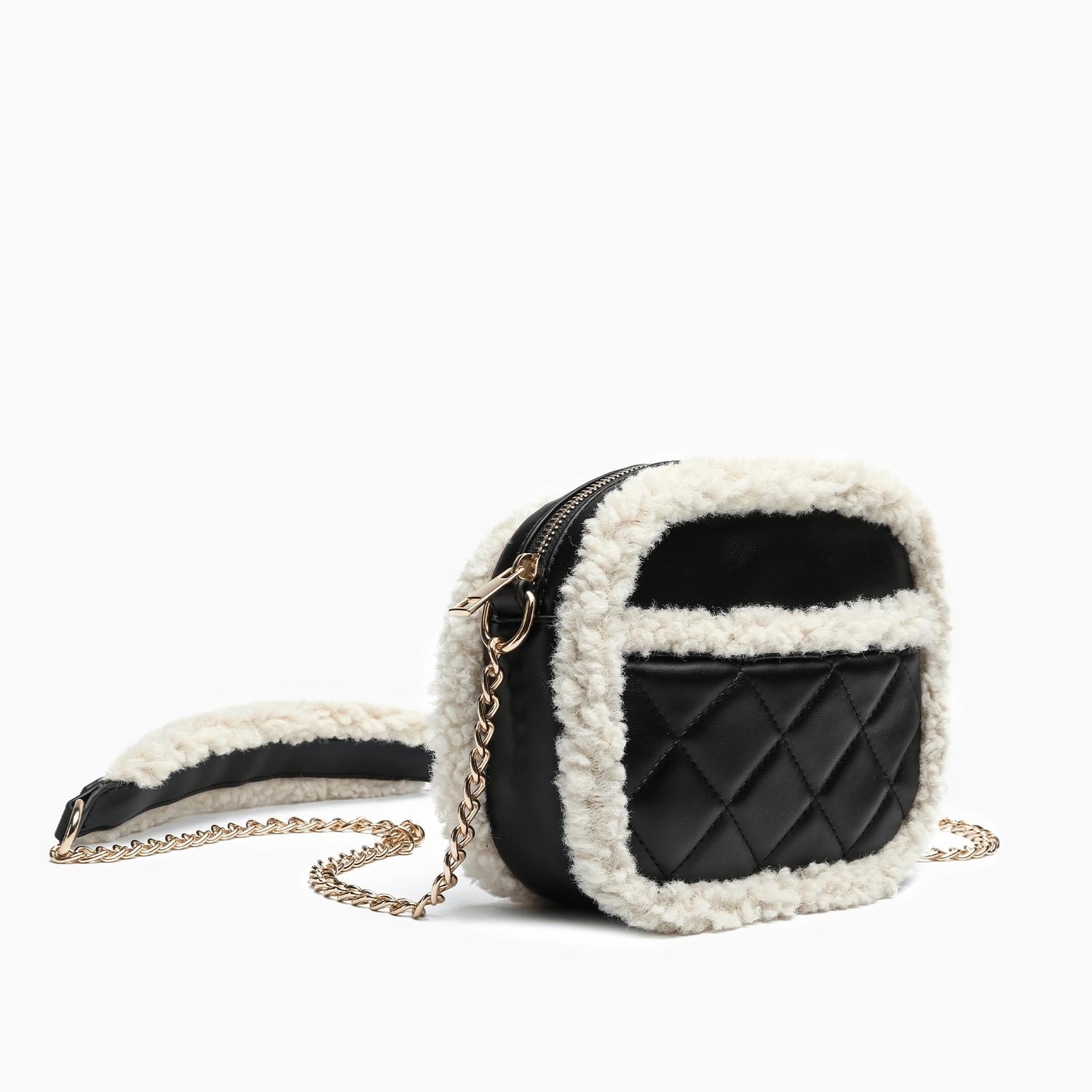 The Women's Pumpkin Patch Vegan Sherpa Crossbody Bag by Like Dreams is a chic accessory perfect for your winter wardrobe. It features a premium vegan leather design accented with sherpa framing and quilted stitching. This black crossbody includes a 22" long gold chain strap with a comfortable shearling shoulder cushion. Dimensions: 9"W x 6.5"H x 3.5"D. Closure: Zipper closure. Ideal for carrying essentials with its 1 front slit pocket and 1 inner zip pocket, weighing just 10.62 oz.