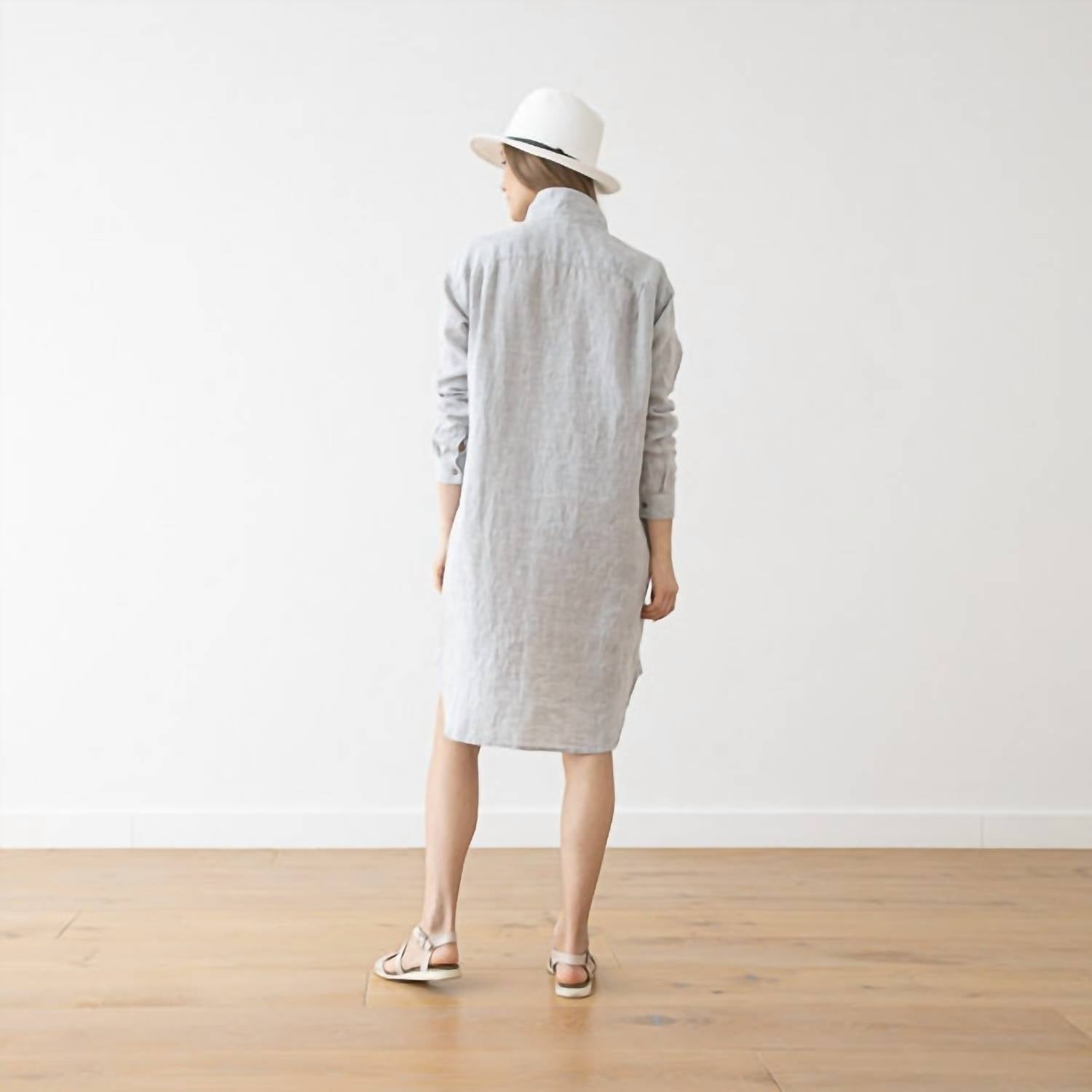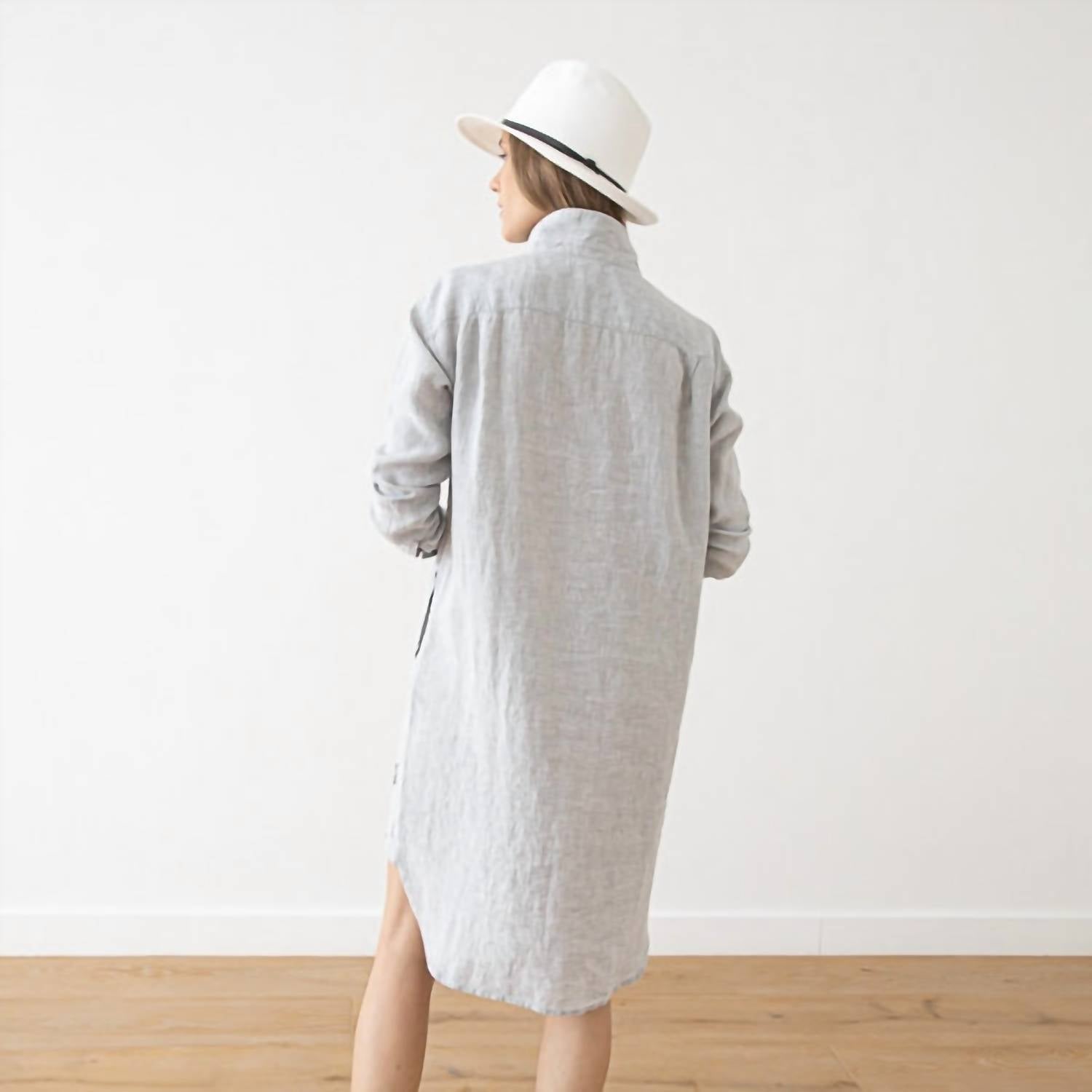 Discover the elegant Paula Linen Shirt Mini Dress by LinenMe, a perfect addition to any minimalist wardrobe. This shift silhouette dress combines long sleeve coverage with the soft texture of 100% linen and features a classic collar and button closure. Proudly crafted in Lithuania, this silver melange dress offers both style and utility with its practical pockets. Designed for easy maintenance, it is machine washable, following simple care instructions to maintain its quality.