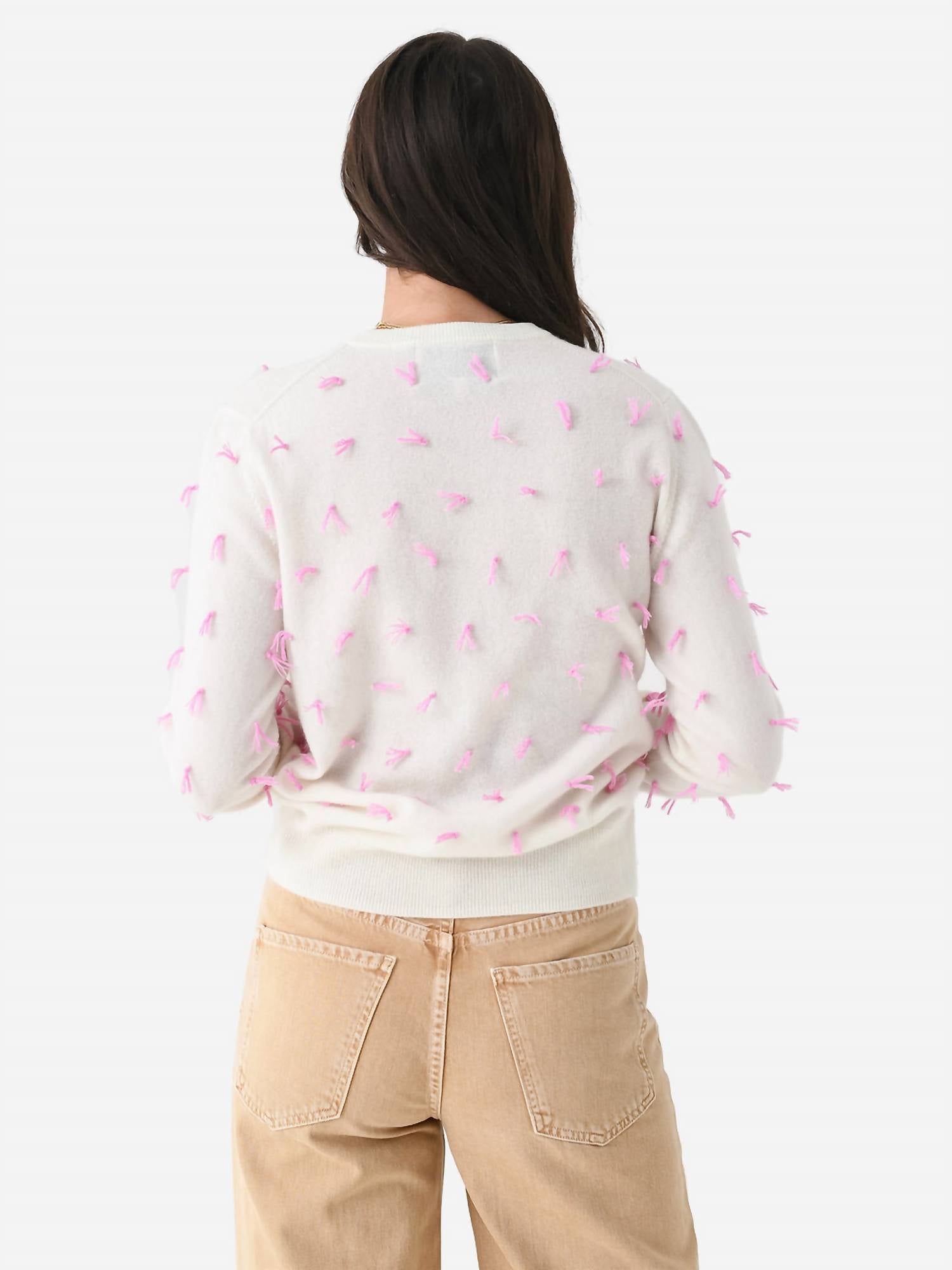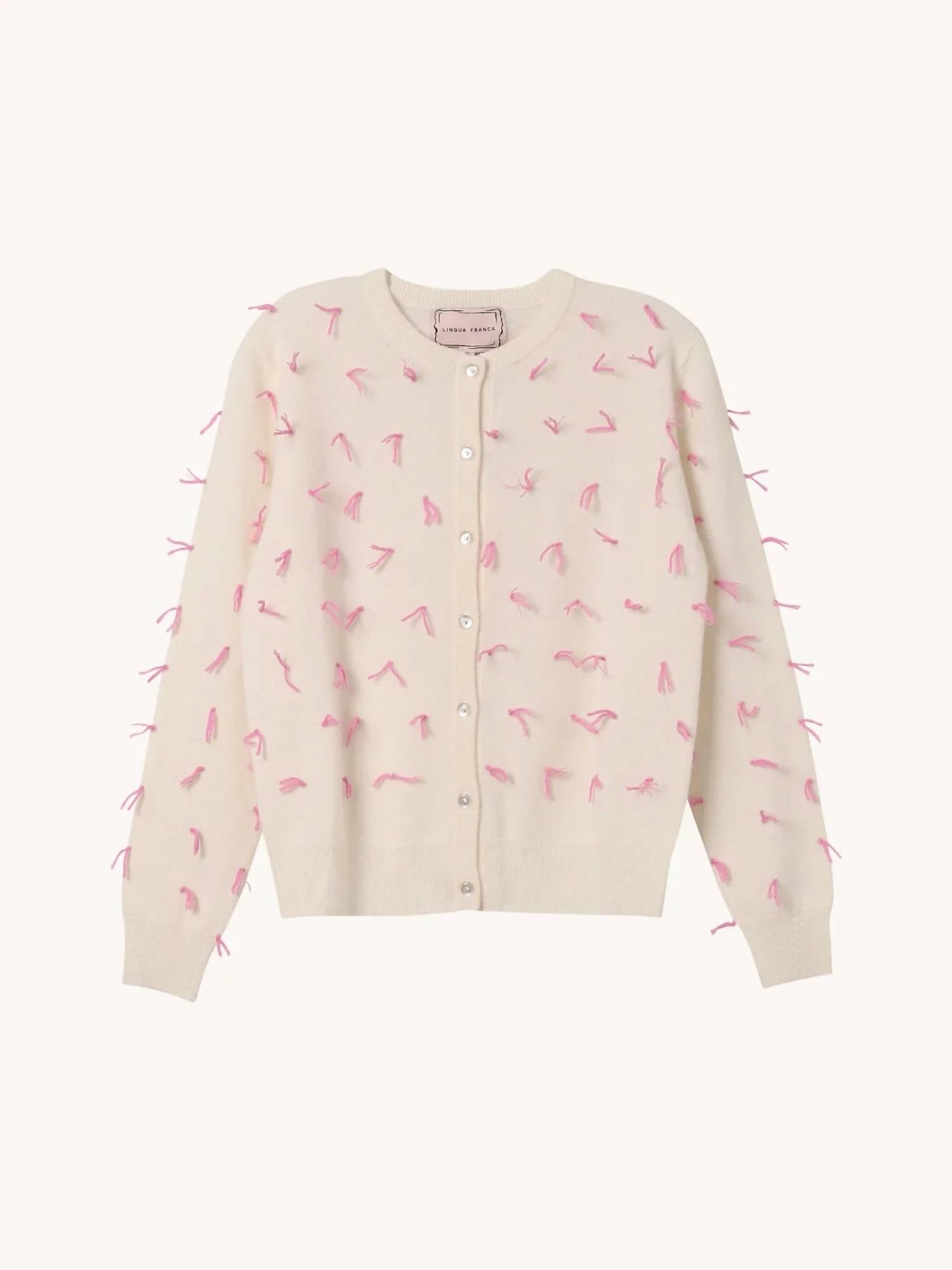 Stay warm and stylish in this versatile and effortlessly cool knitwear staple. Wear it alone or layered, it's the perfect sweater for the season and you'll wish you had it in every color. Introducing the Cream Quilt Knot Cardigan by Lingua Franca, a luxurious addition to your wardrobe from their Fall '23 collection. This long-sleeve, crewneck cardigan is crafted from 100% sustainably sourced cashmere and features an all-over hand-stitched quilt knot fringe detail, accentuated with vintage buttons. Fair trade certified and ethically made in Peru, this piece combines timeless design with modern sustainability. Care instructions recommend hand washing in cold water with mild detergent and laying flat to dry. Closure: Button closure.