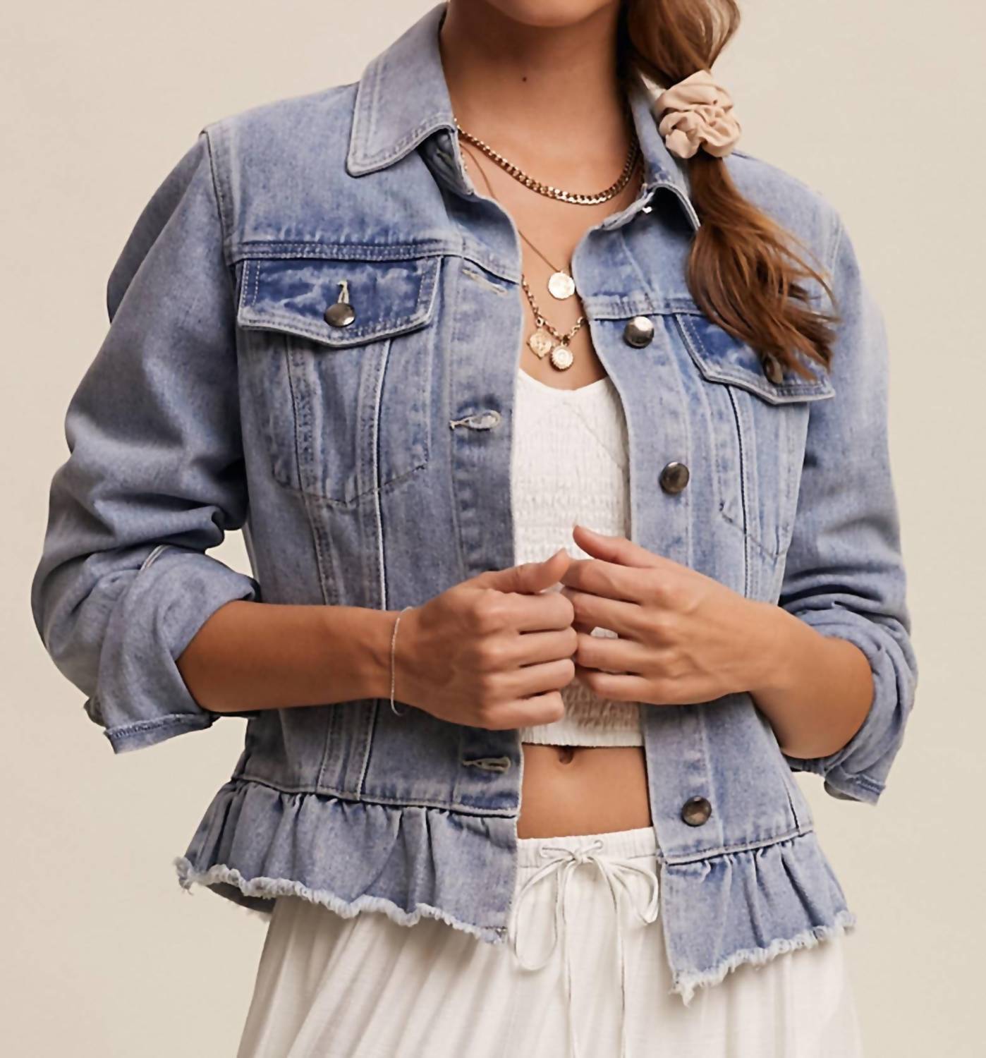 Embrace a feminine twist on a classic with the Ruffled Hem Denim Jacket by Listicle in Light Denim. This solid-pattern jacket features long sleeves with adjustable buttoned cuffs, crafted from soft, faded denim with a vintage-inspired wash. Its classic collared neckline complements the playful ruffled hem and functional chest flap pockets, all secured with a sturdy button closure. Ideal for layering, this unlined piece offers a stylish, comfortable option for any spring wardrobe. Model is 5' 7.5" with measurements 33-24-34, wearing a size Small.