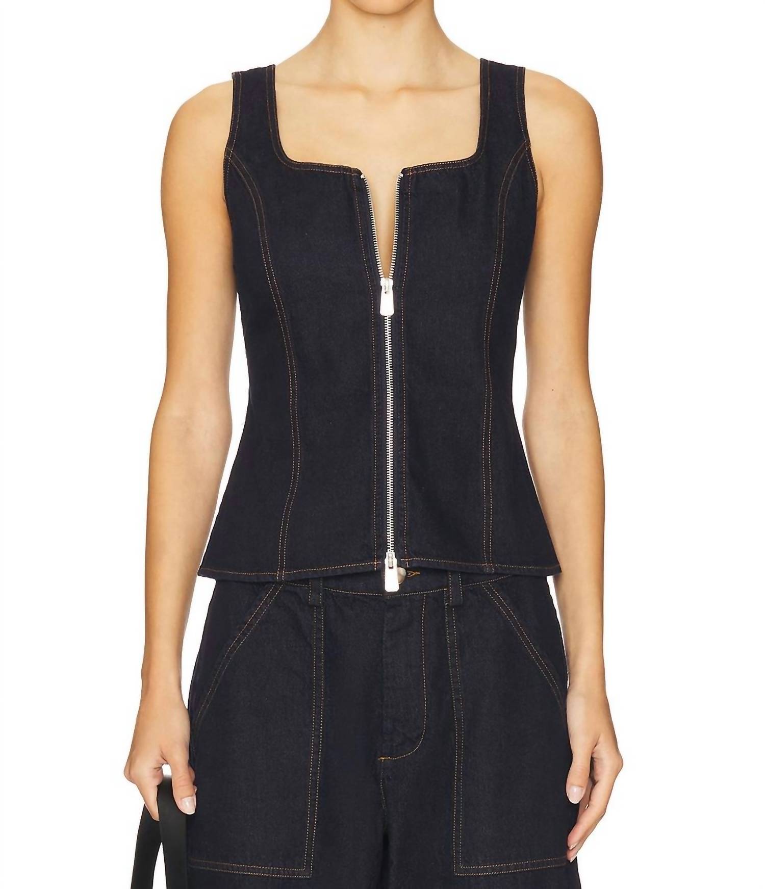 Fit, fabric and functionality. This tank top checks all the boxes. Meet the Gili Zip Tank by LNA, an effortlessly chic addition to your wardrobe. This sleeveless black square-neck tank is crafted from 100% rigid cotton denim for durability and style. Closure: Front zip closure. Care: Machine wash and tumble dry for easy maintenance.