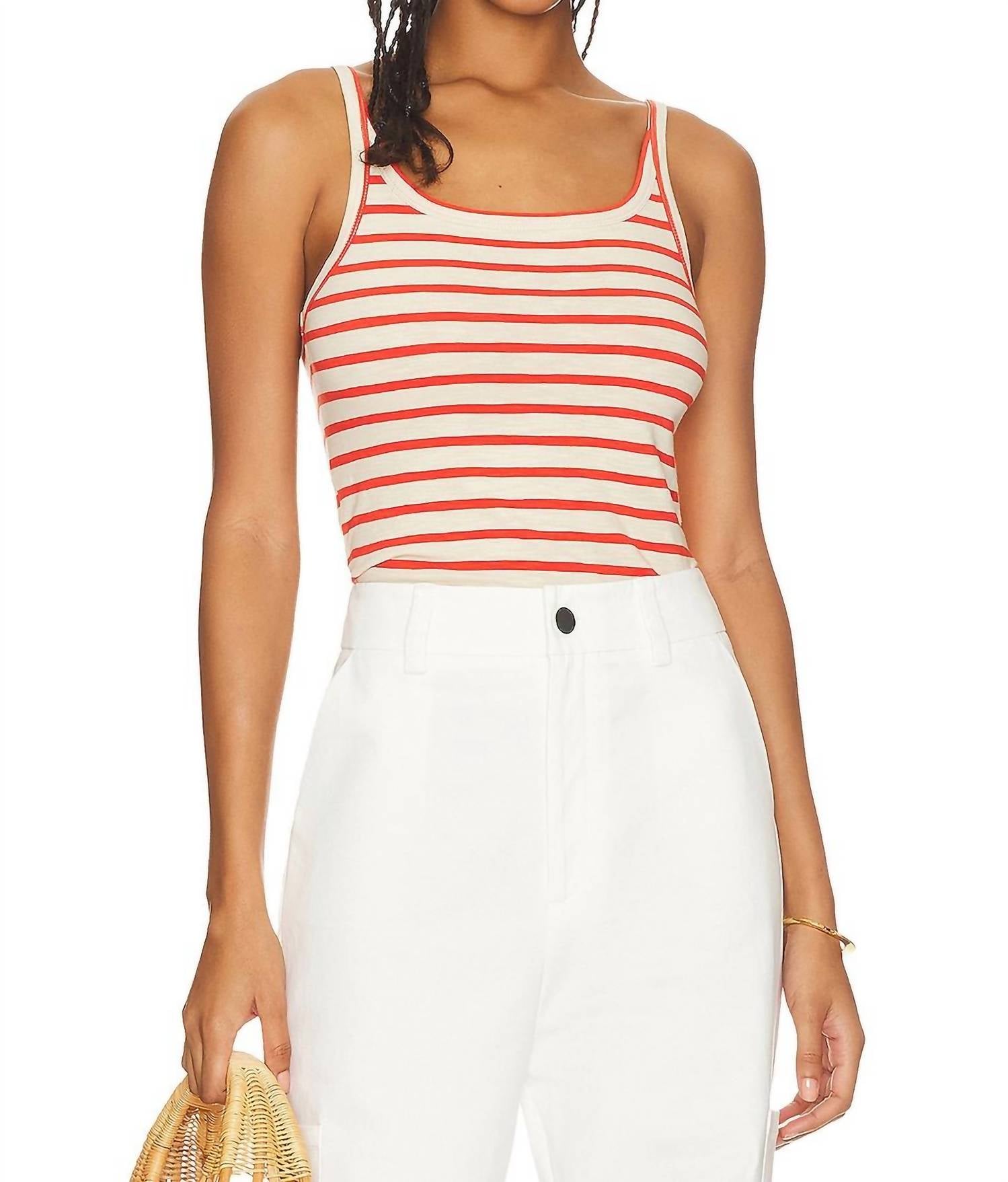 This classic tank top is perfect for layering and cute enough to wear on its own. Introducing the Timeless Cotton Tank Top by LNA, a chic addition to your spring wardrobe, perfect for a Beach Day. This sleeveless top features a scoop neckline and skinny straps, crafted from 100% cotton for comfort and breathability. Designed in a striking Chili Stripe pattern, it offers a pull-on closure for easy wear. Care instructions recommend hand washing and laying flat to dry.