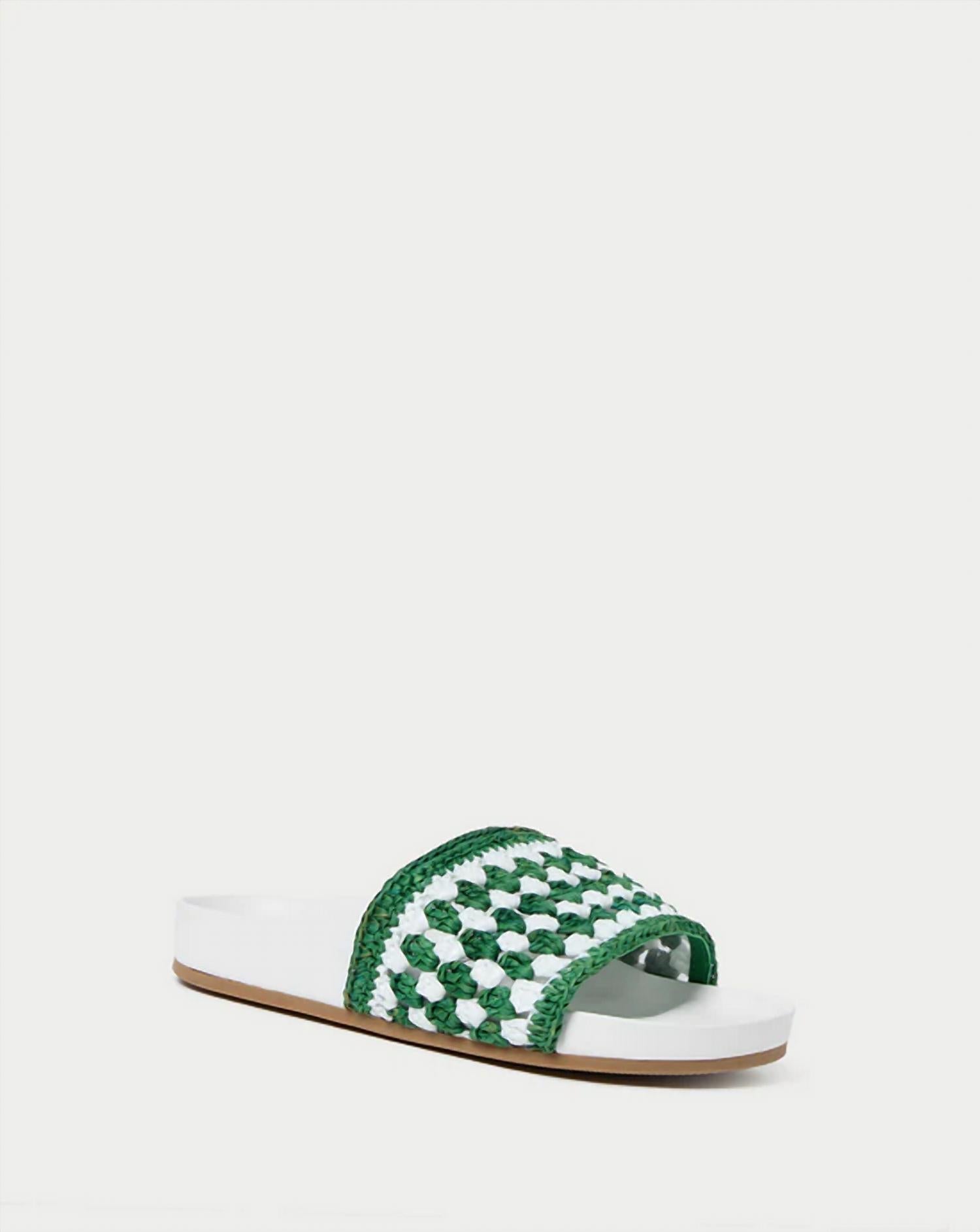 Flowy dresses, cropped pants, and even jumpsuits... this sandal works with them all! Step into style with the Women's Henri Crochet Raffia Sandal by Loeffler Randall, featuring elegant flat heels perfect for game day. Expertly crafted from 100% natural raffia for the upper and 100% rubber for the outsole, these sandals showcase a chic green and white color palette. Made in China, they boast an open toe design ideal for your summer streetwear collection. To maintain their quality appearance, avoid water exposure due to the natural variations of raffia.