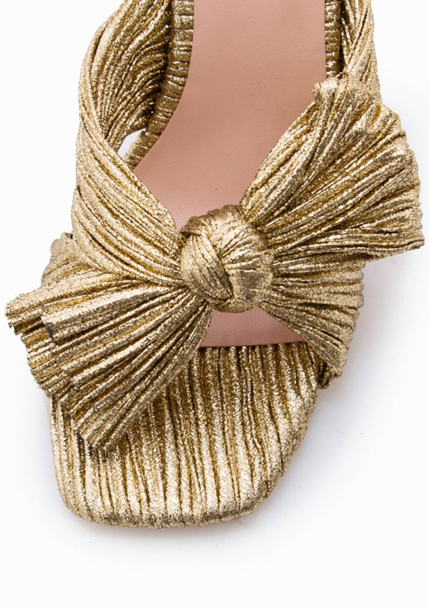 This sandal will take you from brunch to dinner and everything in between. Experience the epitome of quiet luxury with the Women's Loeffler Randall Claudia Pleated Mule Sandal in Oro. Designed with a sophisticated open toe and a stiletto heel measuring 3.25 inches, these sandals exude elegance perfect for summer cocktail parties. The pleated detailing adds a chic touch to this timeless piece, accentuating your style effortlessly. Made for the discerning adult woman, these sandals are crafted to complement any elegant ensemble.