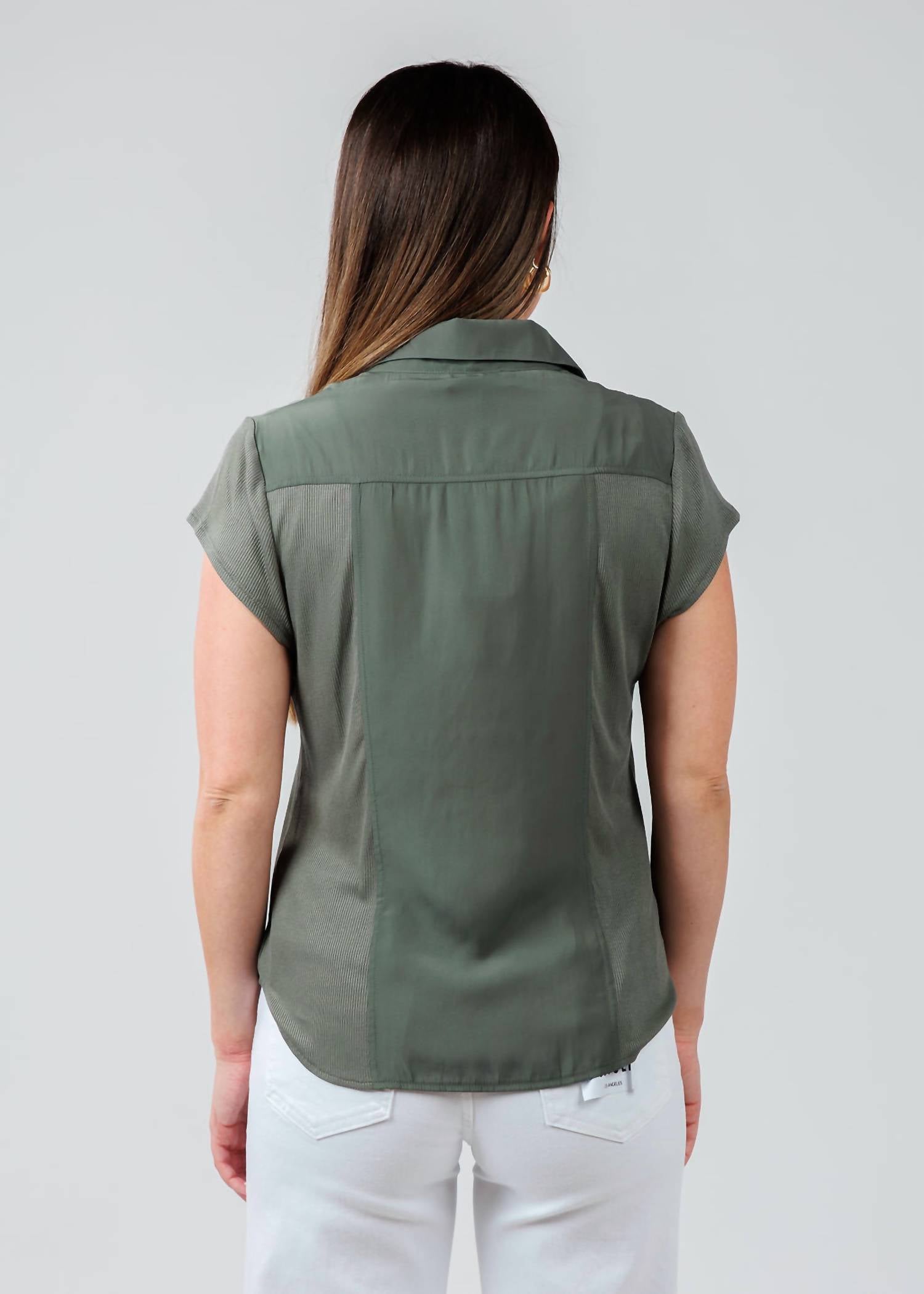 Discover the Lola & Sophie Women's Hybrid Cap Sleeve Shirt in a sophisticated Olive hue, perfect for adding a touch of refinement to your spring wardrobe. Crafted with a unique blend of 100% Polyester and a soft combo of 95% Rayon and 5% Elastane, this short-sleeve tee embodies minimalist elegance with a collar and button front closure. Versatile and relaxed, it features a rounded hem for a chic, casual fit. Care: Machine wash for easy maintenance. Model is wearing a size M.