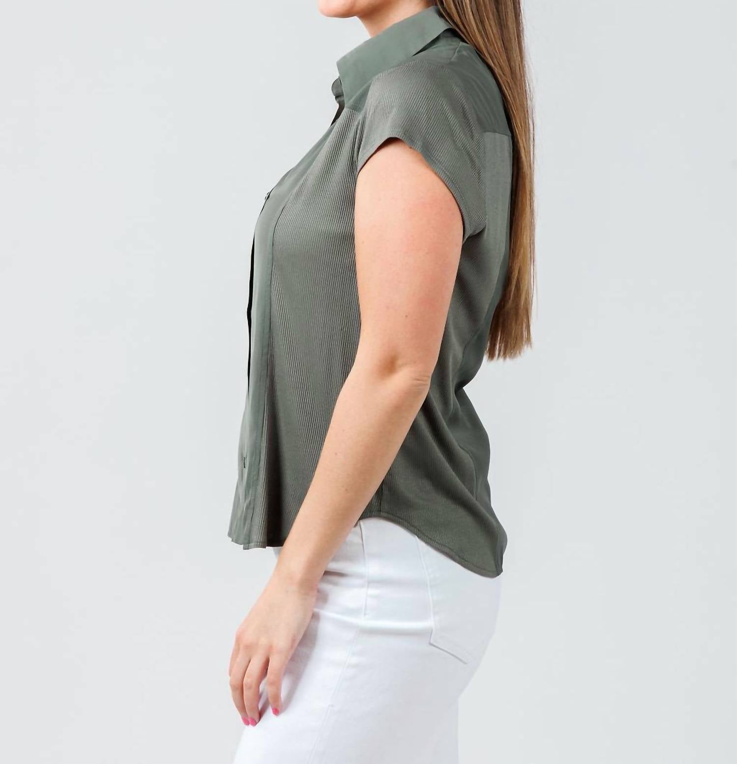 This classic, short sleeve tee will be your go-to staple this season and beyond. Discover the Lola & Sophie Women's Hybrid Cap Sleeve Shirt in a sophisticated Olive hue, perfect for adding a touch of refinement to your spring wardrobe. Crafted with a unique blend of 100% Polyester and a soft combo of 95% Rayon and 5% Elastane, this short-sleeve tee embodies minimalist elegance with a collar and button front closure. Versatile and relaxed, it features a rounded hem for a chic, casual fit. Care: Machine wash for easy maintenance. Model is wearing a size M.