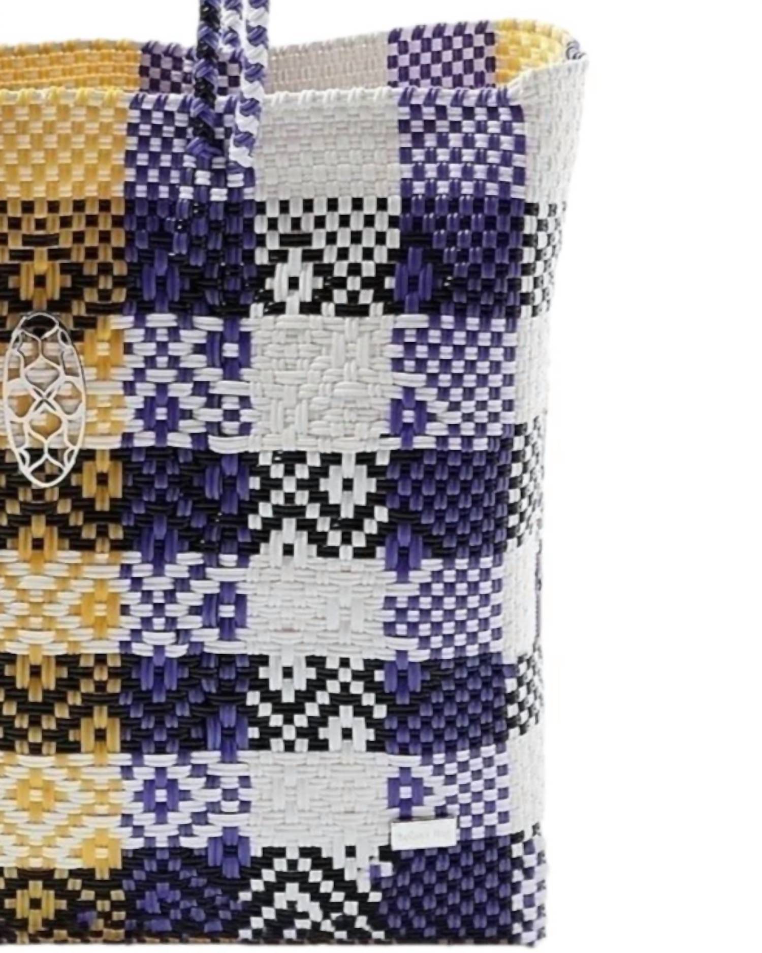 Introducing the Women's Handmade Tote Bag by Lola's Bag, a vibrant accessory in striking Purple Yellow. Crafted from durable, lightweight, waterproof plastic with braided top handles, this tote is both practical and stylish. Featuring a Sterling Silver Plated Signature Medallion, the bag highlights Lola's brand logo plate. Handmade with precision in Mexico, it measures approximately 12.59 x 4.72 x 13 inches. Care: Hand washable. Also available in a smaller size.