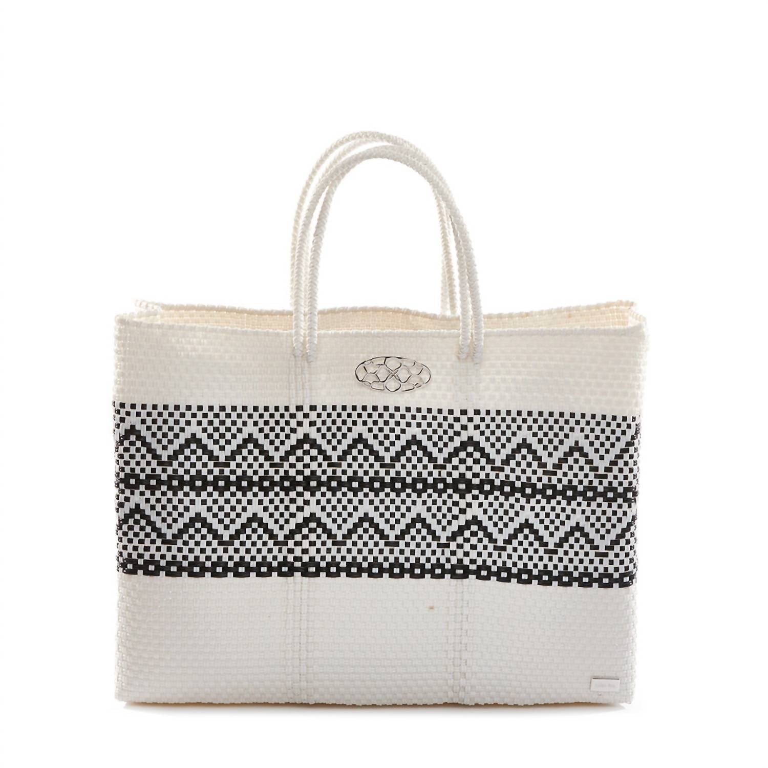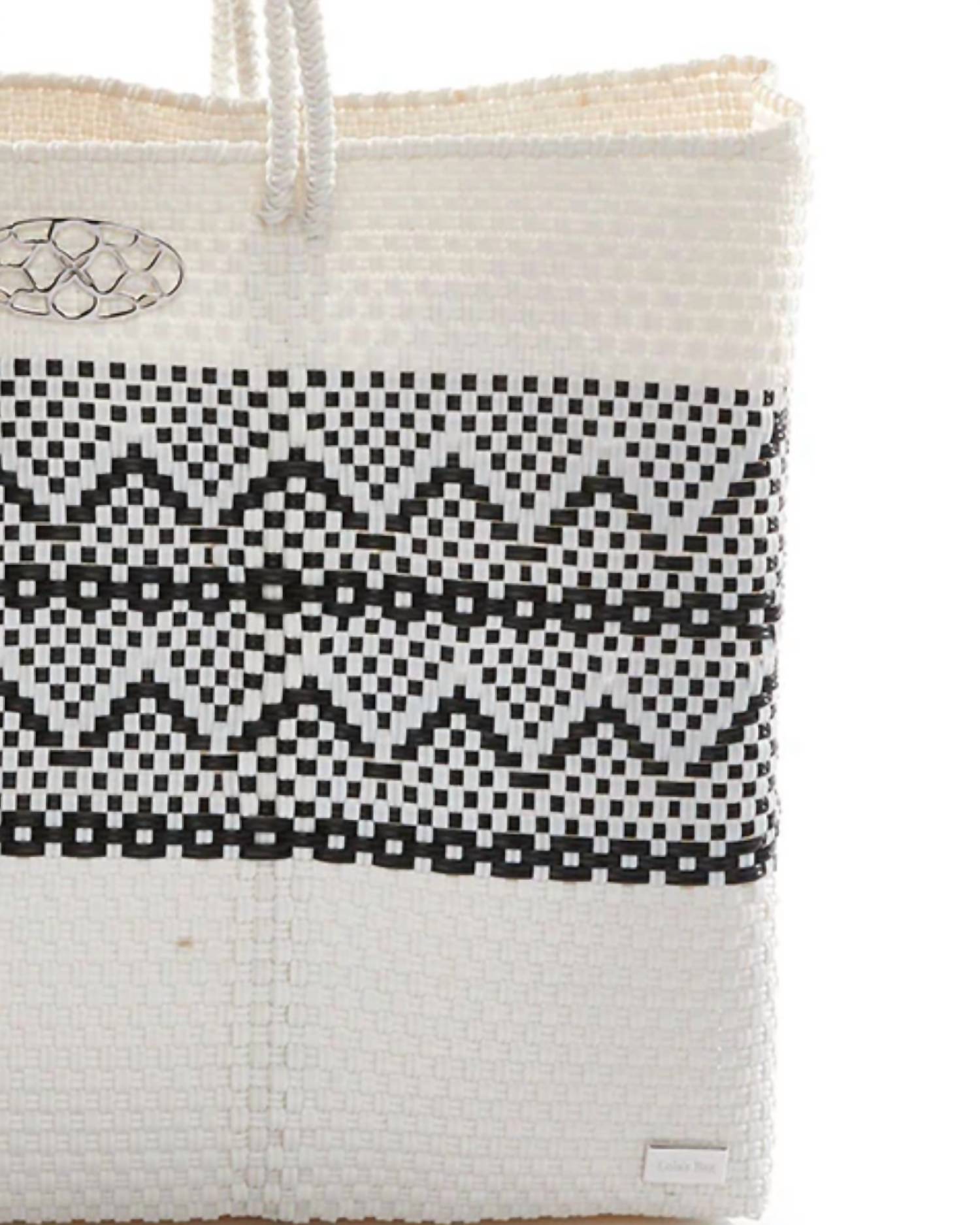 Elevate your accessory collection with Lola's Bag Women's Handmade Tote With Clutch in striking White Blue Aztec. This lightweight and durable tote is crafted from plastic with braided top handles and features a signature 24K Gold Plated Medallion, stating its handmade Mexican authenticity. The water-resistant design makes it perfect for any weather, combining practicality with style. Both pieces are hand washable, with the tote measuring 13.5" x 5.5" x 17" and the clutch at 5" x 8.5" x 1", ideal for all your on-the-go essentials.